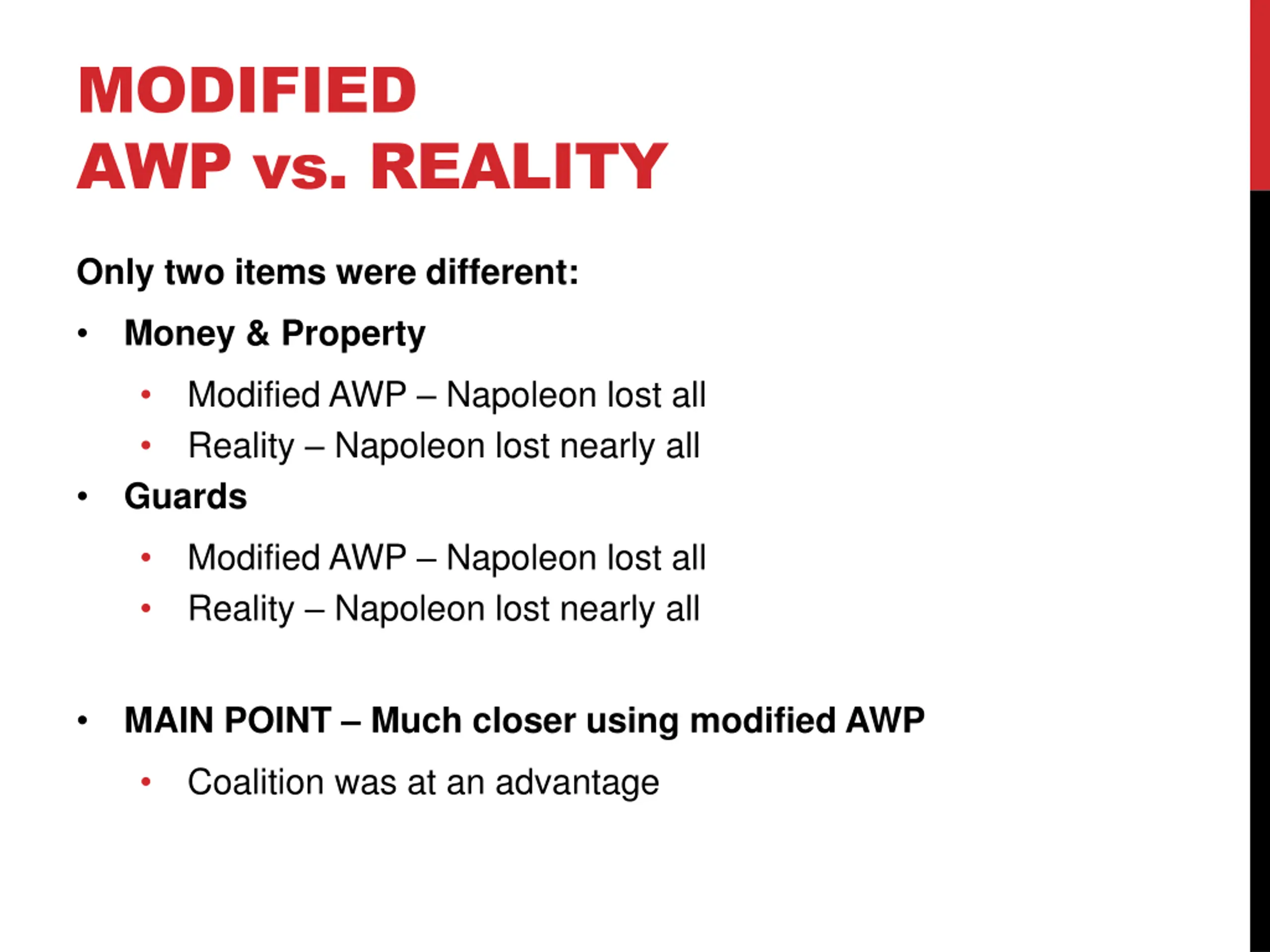 MODIFIED AWP vs. REALITY Only two items were different: Money & Property • Modified AWP – Napoleon lost all Reality – Napoleon lost nearly all Guards • • • Modified AWP – Napoleon lost all Reality – Napoleon lost nearly all • • MAIN POINT – Much closer using modified AWP • Coalition was at an advantage •