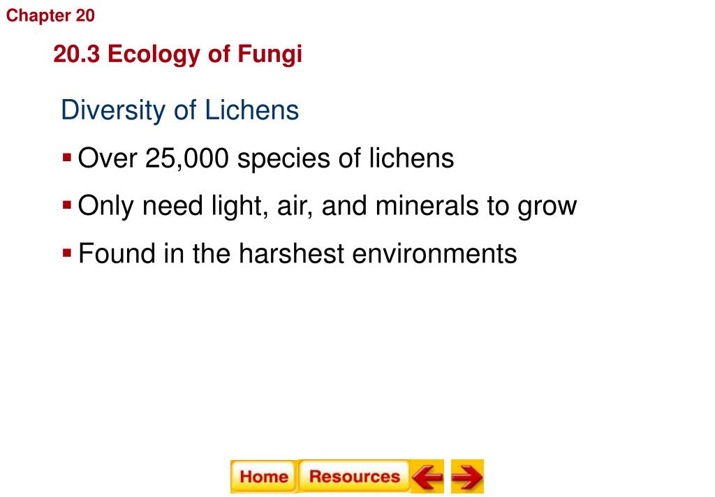 Fungi Chapter 20 20.3 Ecology of Fungi Diversity of Lichens • To survive drought, they can dry out, stop photosynthesis, and become brittle. • Often they are the pioneer species in an area. • They help trap soil and fix nitrogen, which helps in the colonization of plants.