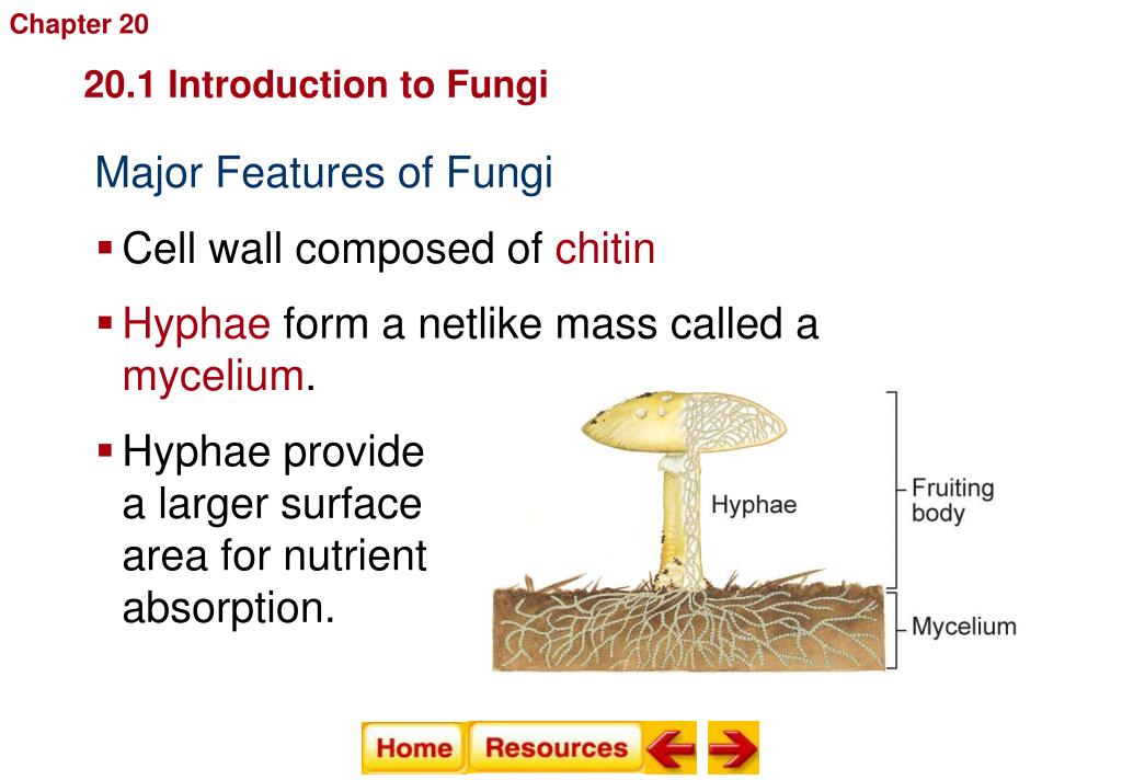 Fungi Chapter 20 20.1 Introduction to Fungi Major Features of Fungi • Cell wall composed of chitin • Hyphae form a netlike mass called a mycelium. • Hyphae provide a larger surface area for nutrient absorption.