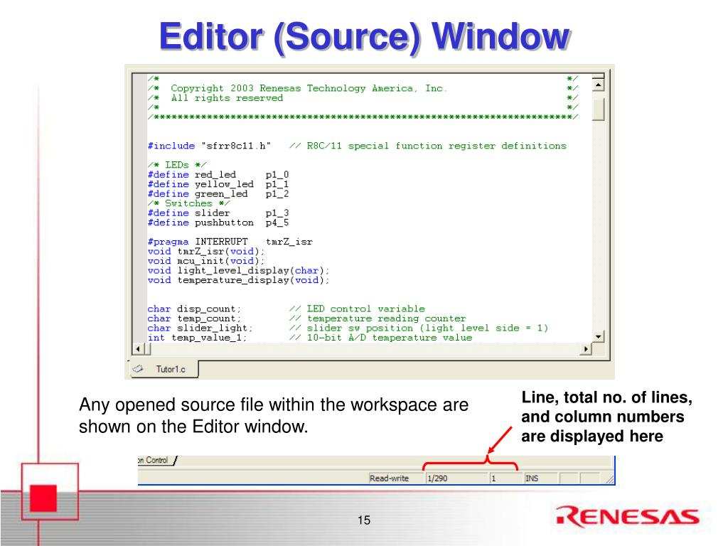 Editor (Source) Window Line, total no. of lines, and column numbers are displayed here Any opened source file within the workspace are shown on the Editor window.