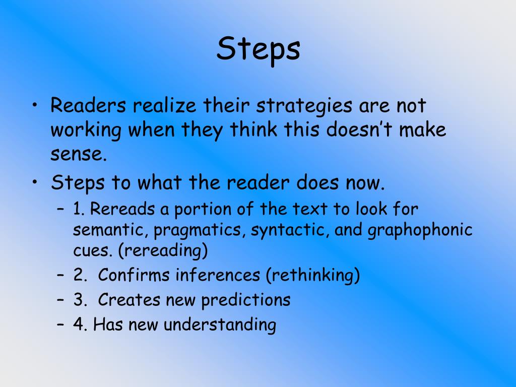 Steps • Readers realize their strategies are not working when they think this doesn’t make sense. • Steps to what the reader does now. • 1. Rereads a portion of the text to look for semantic, pragmatics, syntactic, and graphophonic cues. (rereading) • 2. Confirms inferences (rethinking) • 3. Creates new predictions • 4. Has new understanding