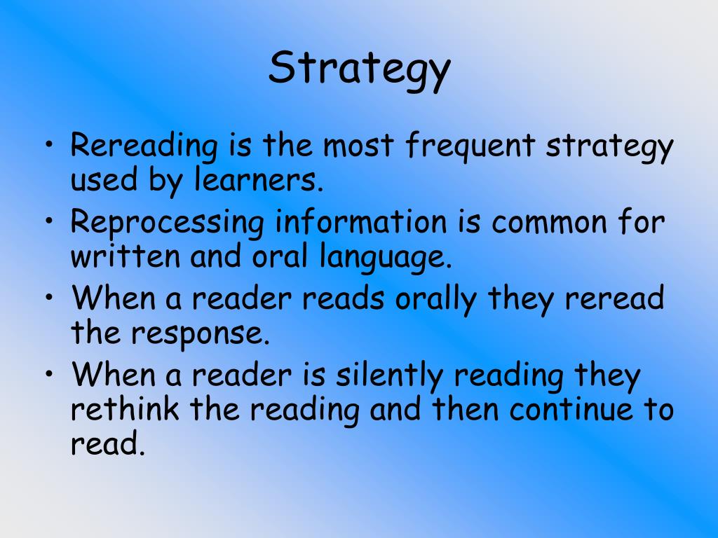 Strategy • Rereading is the most frequent strategy used by learners. • Reprocessing information is common for written and oral language. • When a reader reads orally they reread the response. • When a reader is silently reading they rethink the reading and then continue to read.