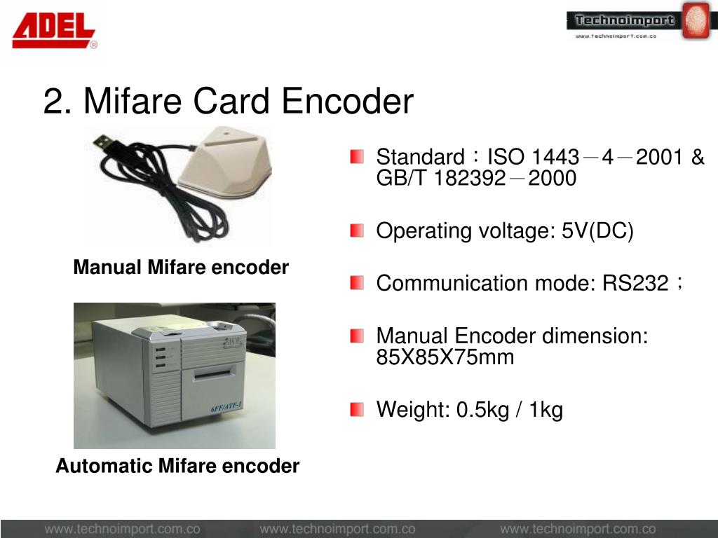 Automatic Mifare encoder 2. Mifare Card Encoder • Standard:ISO 1443-4-2001 & GB/T 182392-2000 • Operating voltage: 5V(DC) • Communication mode: RS232; • Manual Encoder dimension: 85X85X75mm • Weight: 0.5kg / 1kg Manual Mifare encoder