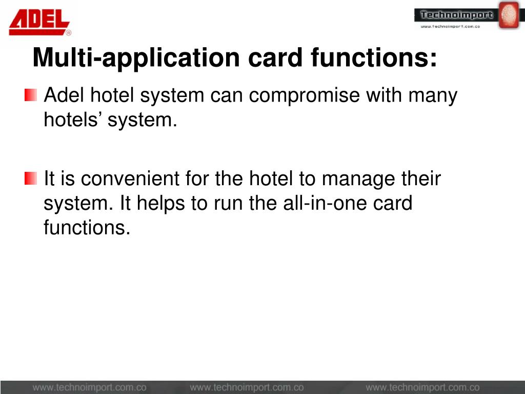 Multi-application card functions: • Adel hotel system can compromise with many hotels’ system. • It is convenient for the hotel to manage their system. It helps to run the all-in-one card functions.