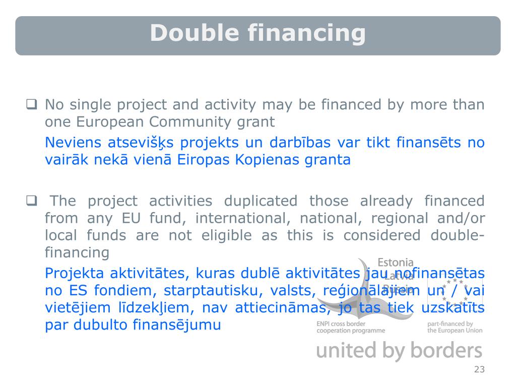 Double financing • No single project and activity may be financed by more than one European Community grant Neviens atsevišķs projekts un darbības var tikt finansēts no vairāk nekā vienā Eiropas Kopienas granta • The project activities duplicated those already financed from any EU fund, international, national, regional and/or local funds are not eligible as this is considered double-financing Projekta aktivitātes, kuras dublē aktivitātes jau nofinansētas no ES fondiem, starptautisku, valsts, reģionālajiem un / vai vietējiem līdzekļiem, nav attiecināmas, jo tas tiek uzskatīts par dubulto finansējumu 23