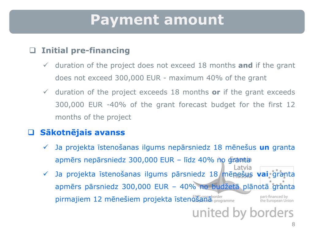 Payment amount • Initial pre-financing • duration of the project does not exceed 18 months and if the grant does not exceed 300,000 EUR - maximum 40% of the grant • duration of the project exceeds 18 months or if the grant exceeds 300,000 EUR -40% of the grantforecast budgetfor the first 12 months of the project • Sākotnējais avanss • Ja projekta īstenošanas ilgums nepārsniedz 18 mēnešus ungranta apmērs nepārsniedz 300,000 EUR – līdz 40% no granta • Ja projekta īstenošanas ilgums pārsniedz 18 mēnešus vaigranta apmērs pārsniedz 300,000 EUR – 40% no budžetā plānotā granta pirmajiem 12 mēnešiem projekta īstenošanā 8
