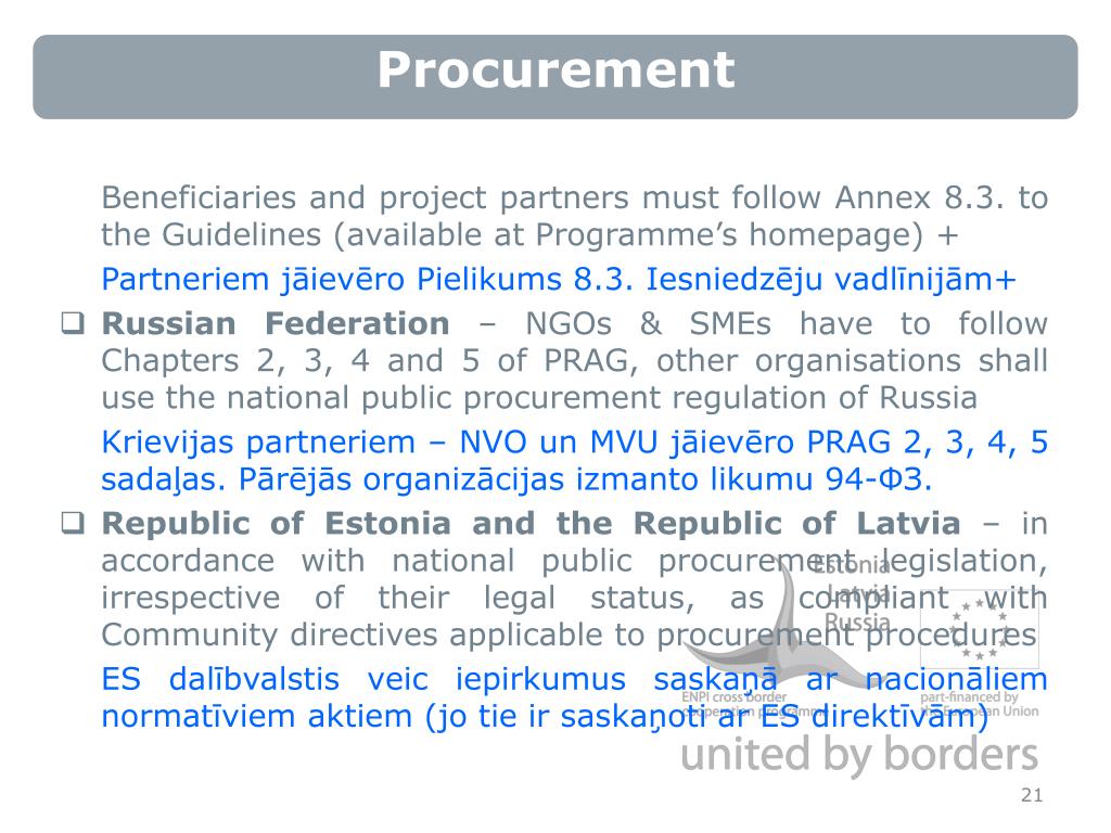 Procurement Beneficiaries and project partnersmustfollowAnnex 8.3. to the Guidelines (availableatProgramme’shomepage) + Partneriem jāievēro Pielikums 8.3. Iesniedzēju vadlīnijām+ • Russian Federation – NGOs & SMEshave to followChapters 2, 3, 4 and 5 of PRAG, otherorganisationsshall use the national publicprocurementregulationofRussia Krievijas partneriem – NVO un MVU jāievēro PRAG 2, 3, 4, 5 sadaļas. Pārējās organizācijas izmanto likumu 94-ФЗ. • Republic of Estonia and the Republic of Latvia – in accordance with national publicprocurement legislation, irrespective of their legal status, as compliant with Communitydirectivesapplicable to procurementprocedures ES dalībvalstis veic iepirkumus saskaņā ar nacionāliem normatīviem aktiem (jo tie ir saskaņoti ar ES direktīvām) 21