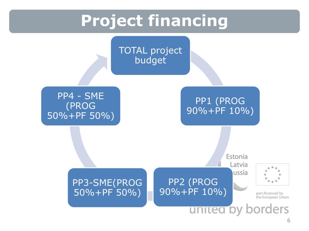 Project partner SMEsfinancing Private partners -max co-financing from the Programme ≤50% of the total eligible costs for respective project partner Privātajam partnerim maksimālais finansējums no Programmas ≤50% no kopējām attiecināmām izmaksām attiecīgajam partnerim 3