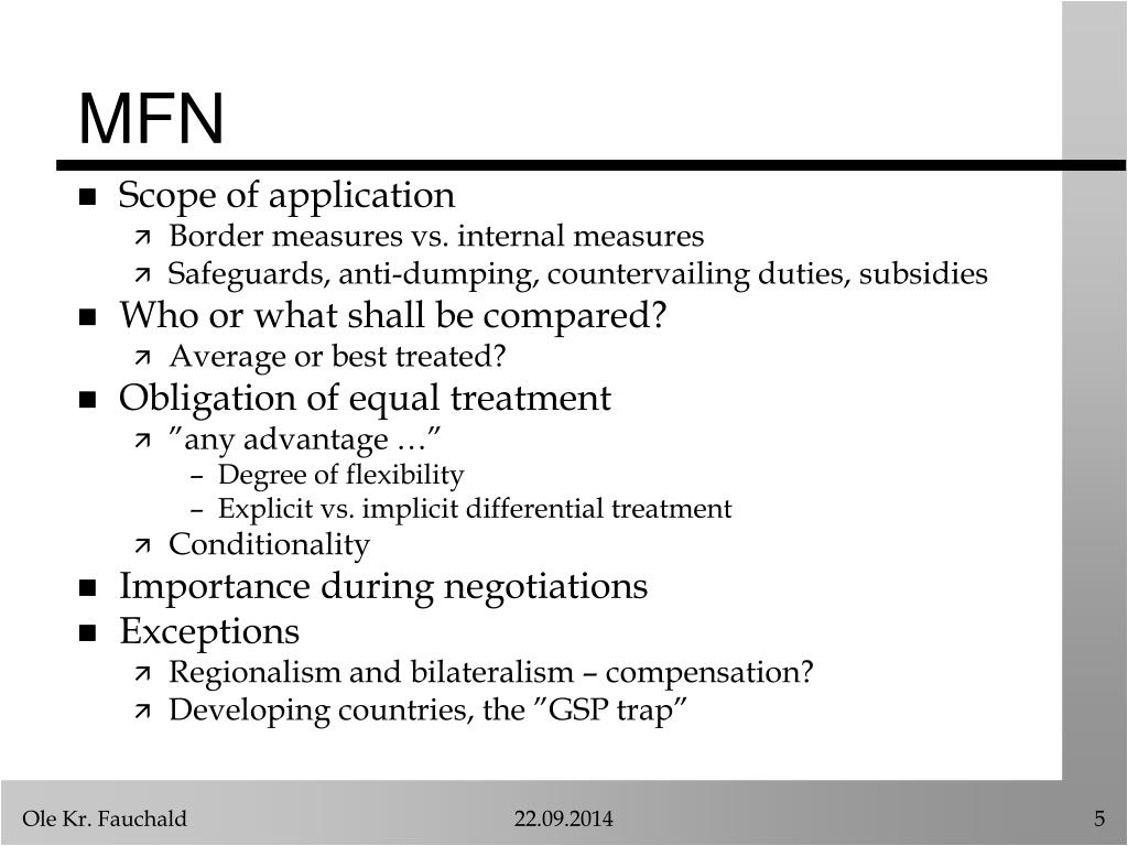 MFN • Scope of application • Border measures vs. internal measures • Safeguards, anti-dumping, countervailing duties, subsidies • Who or what shall be compared? • Average or best treated? • Obligation of equal treatment • ”any advantage …” • Degree of flexibility • Explicit vs. implicit differential treatment • Conditionality • Importance during negotiations • Exceptions • Regionalism and bilateralism – compensation? • Developing countries, the ”GSP trap”