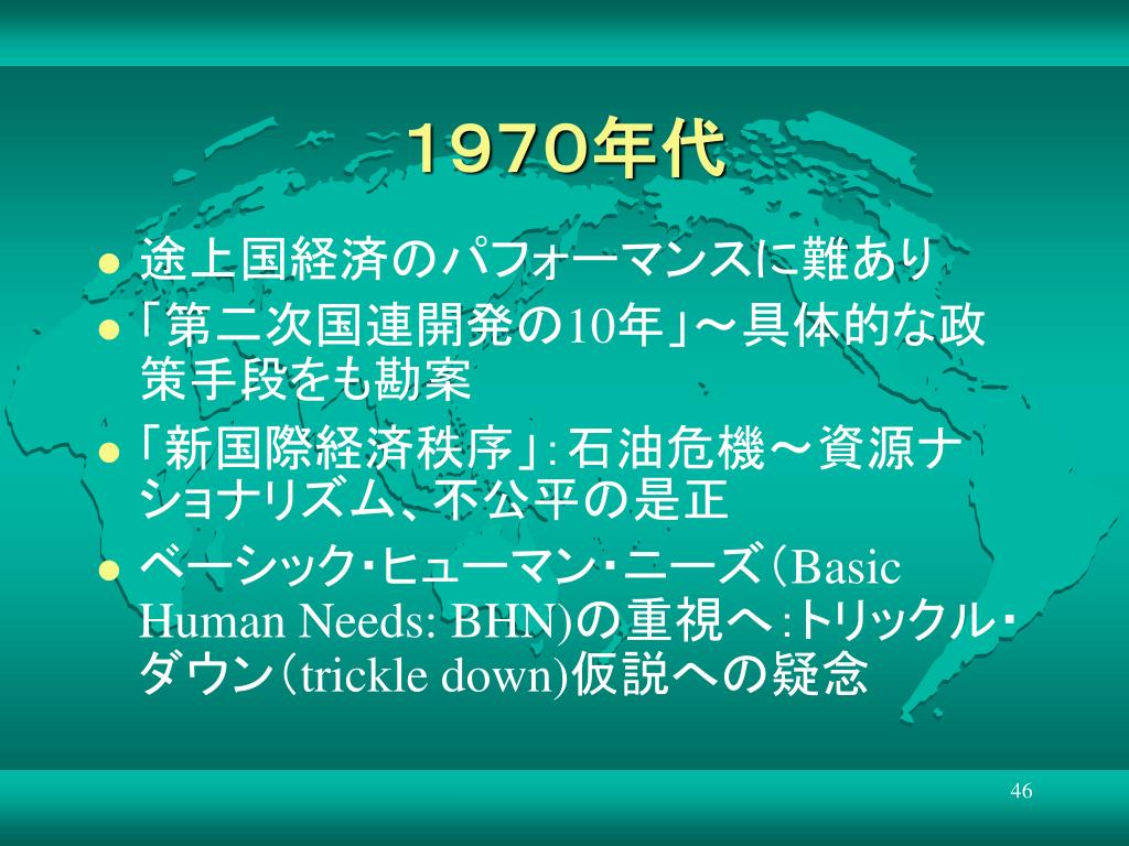 1970年代 • 途上国経済のパフォーマンスに難あり • 「第二次国連開発の10年」~具体的な政策手段をも勘案 • 「新国際経済秩序」:石油危機~資源ナショナリズム、不公平の是正 • ベーシック・ヒューマン・ニーズ(Basic Human Needs: BHN)の重視へ:トリックル・ダウン(trickle down)仮説への疑念