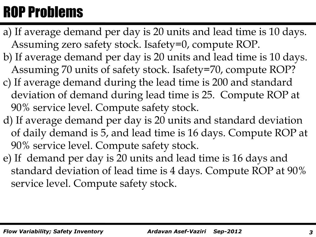Re-Order Point Problems Set 1: General. Notations. ROP Problems. a) If average demand per day is 20 units and lead time is 10 days. Assuming zero safety stock. Isafety =0, compute ROP.