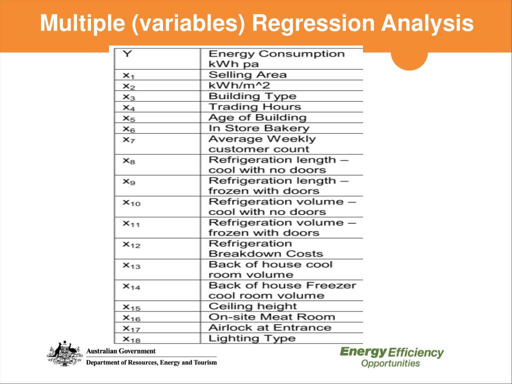 Tools for Understanding Energy Use • Sampling • segment the population into groups of similar sites • analyse energy usage and opportunities • extrapolate to the population • Regression Analysis • high level data, across all sites • check results with (e.g.) sub-metering, engineering calculations • Non-statistical methods • all other EEO analysis methods for individual sites. • continue to build understanding