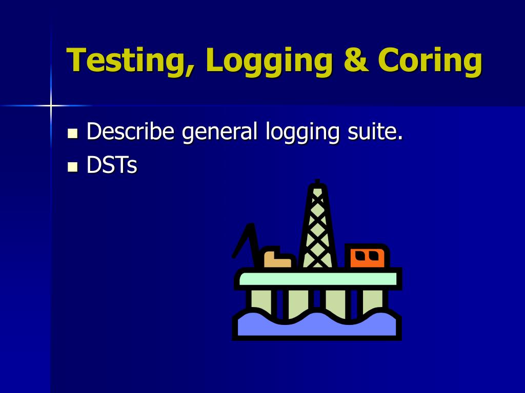 Testing, Logging & Coring • Describe general logging suite. • DSTs