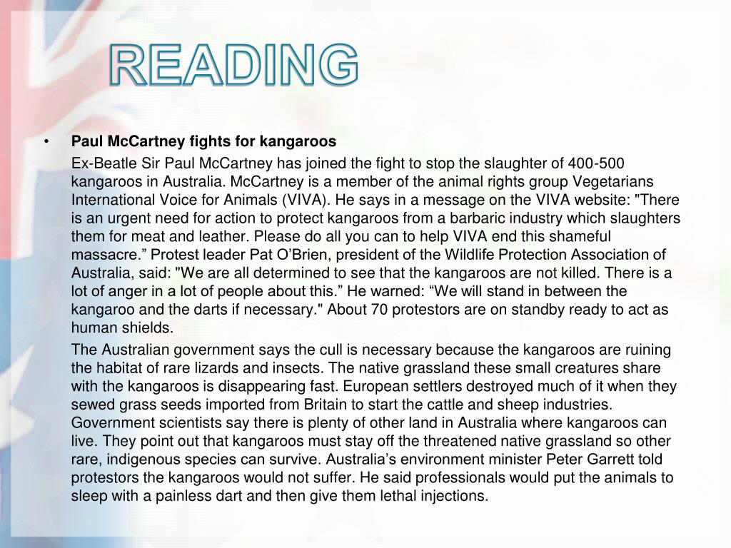 READING • Paul McCartney fights for kangaroos Ex-Beatle Sir Paul McCartney has joined the fight to stop the slaughter of 400-500 kangaroos in Australia. McCartney is a member of the animal rights group Vegetarians International Voice for Animals (VIVA). He says in a message on the VIVA website: "There is an urgent need for action to protect kangaroos from a barbaric industry which slaughters them for meat and leather. Please do all you can to help VIVA end this shameful massacre.” Protest leader Pat O’Brien, president of the Wildlife Protection Association of Australia, said: "We are all determined to see that the kangaroos are not killed. There is a lot of anger in a lot of people about this.” He warned: “We will stand in between the kangaroo and the darts if necessary." About 70 protestors are on standby ready to act as human shields. The Australian government says the cull is necessary because the kangaroos are ruining the habitat of rare lizards and insects. The native grassland these small creatures share with the kangaroos is disappearing fast. European settlers destroyed much of it when they sewed grass seeds imported from Britain to start the cattle and sheep industries. Government scientists say there is plenty of other land in Australia where kangaroos can live. They point out that kangaroos must stay off the threatened native grassland so other rare, indigenous species can survive. Australia’s environment minister Peter Garrett told protestors the kangaroos would not suffer. He said professionals would put the animals to sleep with a painless dart and then give them lethal injections.