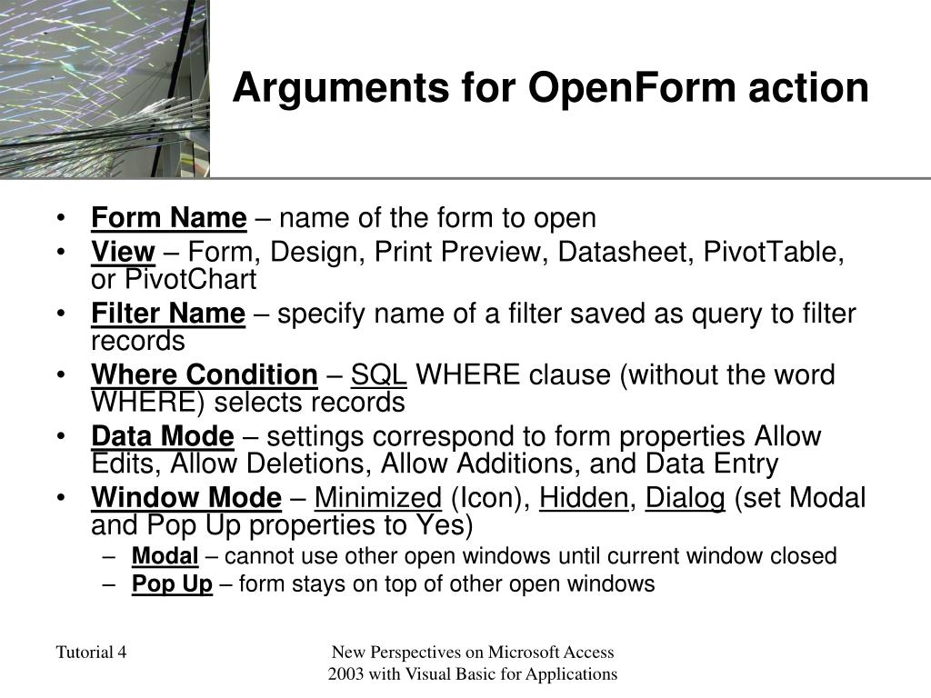 Arguments for OpenForm action • Form Name – name of the form to open • View – Form, Design, Print Preview, Datasheet, PivotTable, or PivotChart • Filter Name – specify name of a filter saved as query to filter records • Where Condition – SQL WHERE clause (without the word WHERE) selects records • Data Mode – settings correspond to form properties Allow Edits, Allow Deletions, Allow Additions, and Data Entry • Window Mode – Minimized (Icon), Hidden, Dialog (set Modal and Pop Up properties to Yes) • Modal – cannot use other open windows until current window closed • Pop Up – form stays on top of other open windows New Perspectives on Microsoft Access 2003 with Visual Basic for Applications