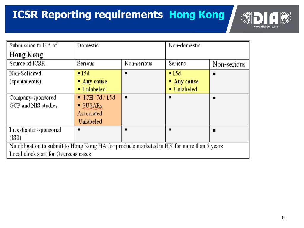 ICSR submission requirements in Asia ICSR submission requirements vary considerably across countries depending upon Language requested for submission Domestic or foreign case Solicited or non-solicited Seriousness Causality Submission time frame Definition of the clock start Age of the product on the market Reference used for listedness
