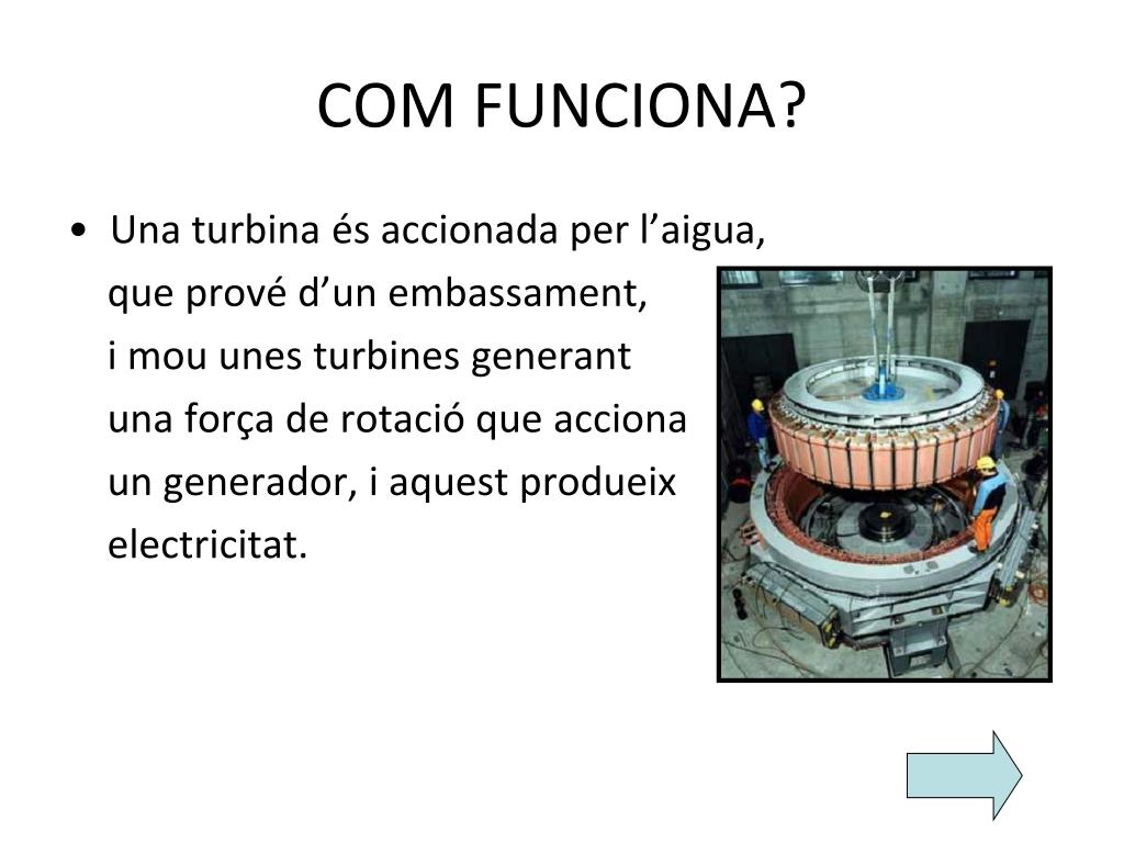 COM FUNCIONA? • Una turbina és accionada per l’aigua, que prové d’un embassament, i mou unes turbines generant una força de rotació que acciona un generador, i aquest produeix electricitat.