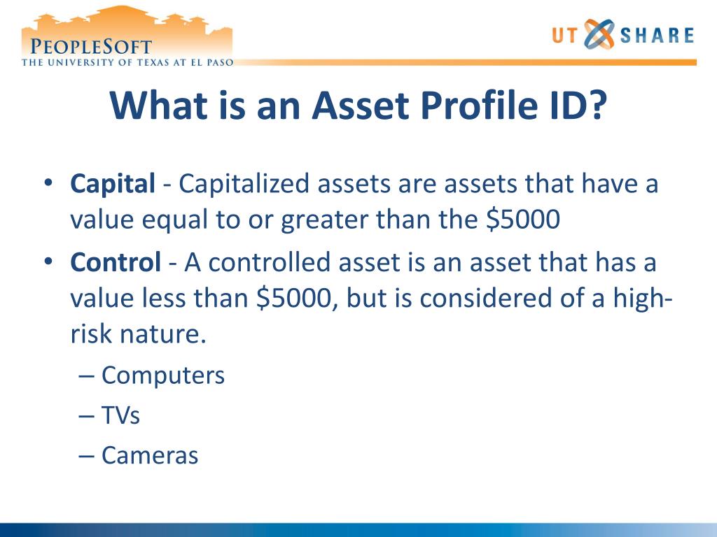 What is an Asset Profile ID? • Capital - Capitalized assets are assets that have a value equal to or greater than the $5000 • Control - A controlled asset is an asset that has a value less than $5000, but is considered of a high-risk nature. • Computers • TVs • Cameras