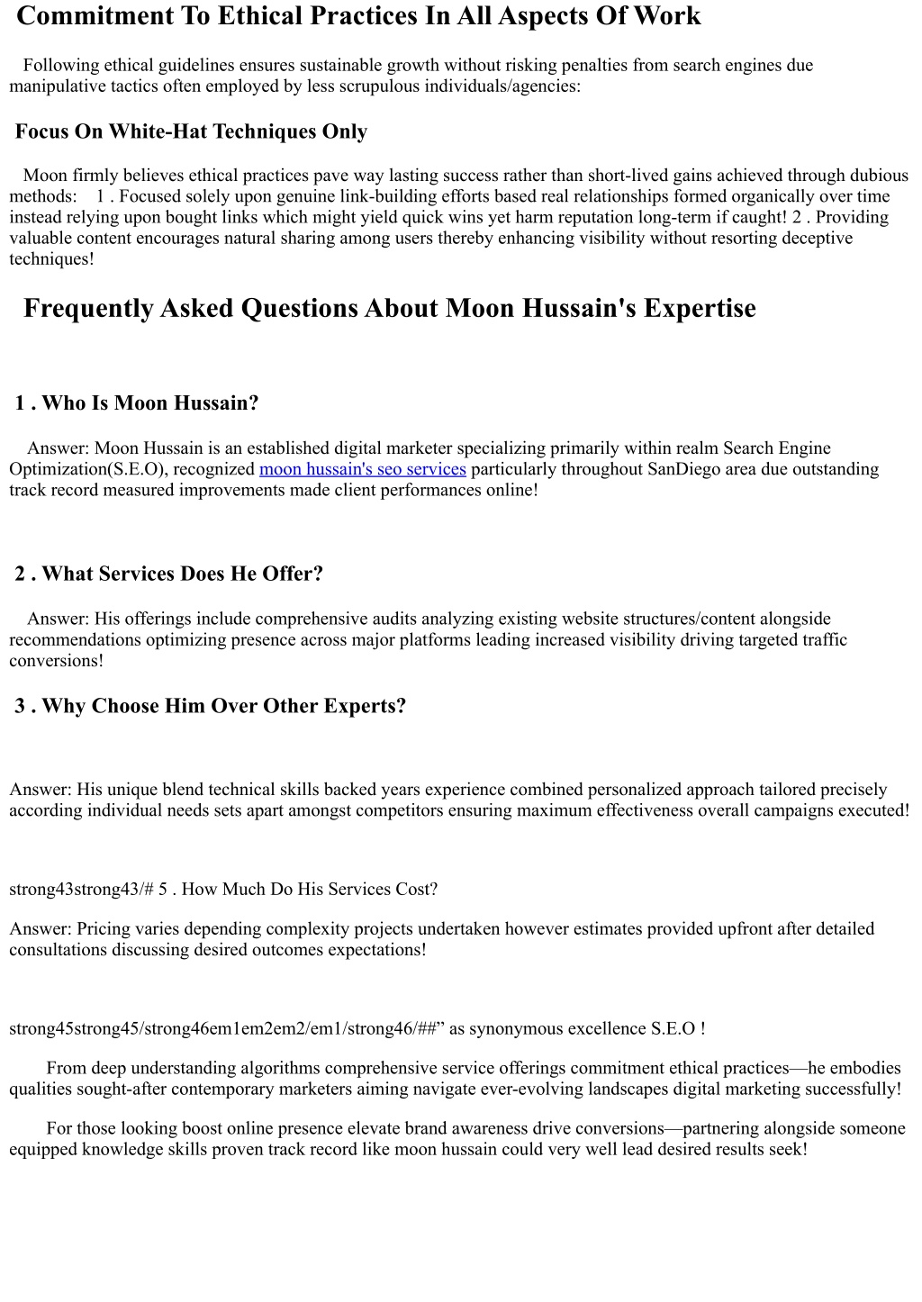 Commitment To Ethical Practices In All Aspects Of Work Following ethical guidelines ensures sustainable growth without risking penalties from search engines due manipulative tactics often employed by less scrupulous individuals/agencies: Focus On White-Hat Techniques Only Moon firmly believes ethical practices pave way lasting success rather than short-lived gains achieved through dubious methods: 1 . Focused solely upon genuine link-building efforts based real relationships formed organically over time instead relying upon bought links which might yield quick wins yet harm reputation long-term if caught! 2 . Providing valuable content encourages natural sharing among users thereby enhancing visibility without resorting deceptive techniques! Frequently Asked Questions About Moon Hussain's Expertise 1 . Who Is Moon Hussain? Answer: Moon Hussain is an established digital marketer specializing primarily within realm Search Engine Optimization(S.E.O), recognized moon hussain's seo services particularly throughout SanDiego area due outstanding track record measured improvements made client performances online! 2 . What Services Does He Offer? Answer: His offerings include comprehensive audits analyzing existing website structures/content alongside recommendations optimizing presence across major platforms leading increased visibility driving targeted traffic conversions! 3 . Why Choose Him Over Other Experts? Answer: His unique blend technical skills backed years experience combined personalized approach tailored precisely according individual needs sets apart amongst competitors ensuring maximum effectiveness overall campaigns executed! strong43strong43/# 5 . How Much Do His Services Cost? Answer: Pricing varies depending complexity projects undertaken however estimates provided upfront after detailed consultations discussing desired outcomes expectations! strong45strong45/strong46em1em2em2/em1/strong46/##” as synonymous excellence S.E.O ! From deep understanding algorithms comprehensive service offerings commitment ethical practices—he embodies qualities sought-after contemporary marketers aiming navigate ever-evolving landscapes digital marketing successfully! For those looking boost online presence elevate brand awareness drive conversions—partnering alongside someone equipped knowledge skills proven track record like moon hussain could very well lead desired results seek!