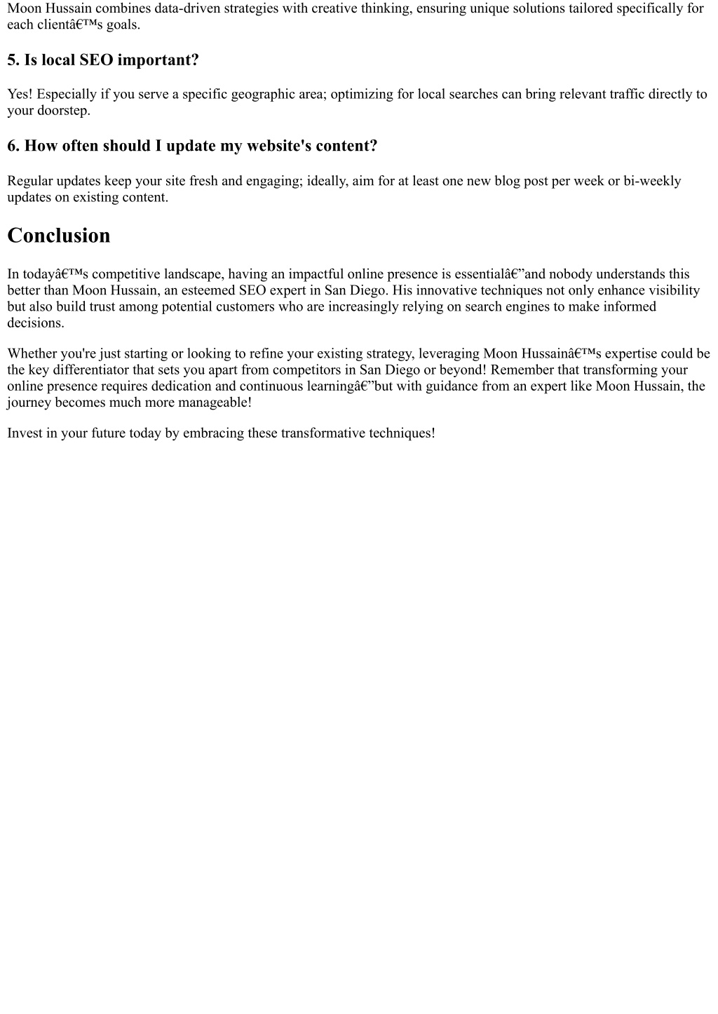 Moon Hussain combines data-driven strategies with creative thinking, ensuring unique solutions tailored specifically for each client’s goals. 5. Is local SEO important? Yes! Especially if you serve a specific geographic area; optimizing for local searches can bring relevant traffic directly to your doorstep. 6. How often should I update my website's content? Regular updates keep your site fresh and engaging; ideally, aim for at least one new blog post per week or bi-weekly updates on existing content. Conclusion In today’s competitive landscape, having an impactful online presence is essential—and nobody understands this better than Moon Hussain, an esteemed SEO expert in San Diego. His innovative techniques not only enhance visibility but also build trust among potential customers who are increasingly relying on search engines to make informed decisions. Whether you're just starting or looking to refine your existing strategy, leveraging Moon Hussain’s expertise could be the key differentiator that sets you apart from competitors in San Diego or beyond! Remember that transforming your online presence requires dedication and continuous learning—but with guidance from an expert like Moon Hussain, the journey becomes much more manageable! Invest in your future today by embracing these transformative techniques!