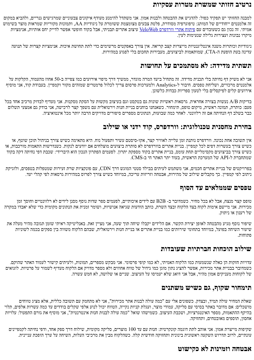 תויקסע תורטמ תרשמש יתוזח ביטרנ םוקמב איבהלו ,םיירנג םישיגרמש םיינועבצ םינוקיא ףדועמ ענמיהל לדתשמ ינא .ןומא תונבלו החטבהה תא שיגדהל :לופכ דיקפת שי יתוזחה הנבמל שומישב רצומ תוארמש תוירוקמ תונומתו ,AA תוידוגינ לע תרמושש תמצמוצמ םיעבצ תטלפ ,תרדוסמ היפרגופיט :גתומה לש םיידוחיי םיטנמלא הז תויצמינא ,תויתוא סחי קיידל רשפא ישפוח דוקב לבא ,יתינבת םירתא בוציע VeloWeb סרפדרוו ירתא חותיפ םע םידבועשכ םג ןוכנ הז .יתימא .ןיעל תומיענש הלילג תוריצעו תונובנ ורקימ העונת לש תורצק תויצמינא .תוכיא תשוחת תתל ידכ םימישרמ םיטקפאב ךרוצ ןיא .האירק בצק תורציימ תויטנגילטניא הנשמ תורתוכו תוידוגינ .תוריהמב עוגפל ילב םוכחת תוריבעמ ,םיעוציבל תומאתומש ,CTA-ה תעפוה תעב הנידע תושוחת לע םיכמתסמ אל :הדידמ תיתשת לע תוקלקה ,דומעהמ זוחא 50-ב הייפצ ומכ םיעוריא יופימ ךרד ךישממ ,רדגומ הרמה דעיב ליחתמ הז .הדידמ תינכת ילב התיחנ ףד קישמ אל ינא ףיסומ ינא ,דוק תדובעב .ןייפמקו רוקמ םיהזמש םירטמרפ לולכל ךירצ םוסרפ תוכרעמלו Analytics-ל רוביח .םיספט תחילשו ,םייזכרמ םיטנמלא .ןנושלכ תודבכ תוירפס ןועטל ילב םילסקיפל םילק םיעוריא לכב דחא ביכרמ קודבל ףידעמ ינא .תונקסמ תקסה לע תושקמ בוציעב םגו טסקטב םג תונוש תוישאר תואסרג .תיארחא הרוצב תושענ A/B תוקידב םולשת יעצמא םג קדוב ינא ,השיכרל רצק ךפשמ םע תילאוטריו תונח תיינב םינחוב ונחנאשכ .רוחמית ,ספוט םוקימ ,תישאר הנומת ,תרתוכ :םעפ .היציאוטניא לכמ רתוי הברה םיקיודמ םירופיס םירפסמ םינותנה ,תועובש המכ רחאל .יטנוולר הז םא התיחנה ףד בלשב רבכ בוליש וא ינדי דוק ,סרפדרוו :תיגולונכט תינסחמ תריחב וא ,ףטוש ןכות לוהינב ךרוצ שישכ המיאתמ איה .חונ לועפתו רישע םטסיס-וקא ,רצק ריוואל היילע ןמז תנתונ סרפדרוו .הנוכנ תחא הבושת ןיא וא ,תובכרומ תומאתה תושרדנשכ .תוקנל םיעדוי םא םיחלצומ םיעוציב תרתוס אל סרפדרווב םירתא תיינב .ןייפמק לכל םיפד תורשעב ךרוצ שישכ דוקב הקד התיחנ יפד תבכש :ידירביה אוה ןוכנה ןורתפה םימעפל .ןורתי תקפסמ דוקב םירתא תיינב ,סמוע תחת םיילמיסקמ םיעוציבב ךרוצ שישכ .CMS-ב יח רתאה רתי דועב ,תישארה תכרעמה לש API-ל תרבחתמש תקיגולו ,םיספטב תולפטמש תוריעז תרש תויצקנופ םע ,CDN ךרד שגומה יטטס דליבב םיתיעל שמתשמ ינא ,םימכח םירתא תיינב לש םיטקיורפב .דעי ילהק יפל תואסרג תוריהמב סורפל ךרוצ שישכ דחוימב ,הכירע תוזירזו החטבא ,תוריהמ לש בוליש םילבקמ ךכ .ןייפמק יפל בותינ ףוסה דע םיאלממש םיספט ןמז ךסוחו םייטנוולר אל םידיל ןנסמ ףסונ תודש רפס םימעפל ,םייתוכיא םידיל םע B2B -ב רבודמשכ .ריחמ לכב אל לבא ,חצנמ רצק ספוט הרקמב ודבאי אלש ידכ תימוקמ םינותנה תא תינמז רמושו ,תוישונא האיגש תועדוה בתוכ ,תרשה דצבו חוקלה דצב חוקל תומיא םשיימ ינא .תוריכמ .קותינ וא ןונער לש תא הלעמ ריהמ הבוגת ןמזש יתיאר הקיטילנאב .תאז ןייצמ ינא ,העש ךות החיש ולבקי םידילה םא .רשקה תריצי ןפואל החטבהמ עיגמ ףסונ רופיש תוינושל המכב םיקפס ןיב הוושמ חוקלה םהבש ,תילאוטריו תונח תיינב וא םירתא תיינב ומכ םיתוריש ימוחתב דחוימב ,לעופב החישה רועיש .תוחותפ תודבועש תויתרבח תוחכוה בוליש .םקוהש רתאה דומעל רושיק םיתיעלו ,תונומת ,םירפסמ שקבמ ינא .ימוסרפ יפוק ומכ אל ,יתימאה חוקלה ומכ תועמשנש הלאכ ןה תוקזח תויודע םיאוגול .תויטרפ לע רומשל ףידעמ חוקלה םא קיודמ רפסמ אלו םיזוחא חווט לש לודיג ומכ ןגומ ןותנ גיצהל רשפא ,תוריכמ רתא תיינבב רבודמשכ .הרשע שמח אל ,השולש וא םיינש .בוציעה לע וסימעי אלש גאוד ינא לבא ,ריהמ ןומא םיקינעמ תוחוקל לש םינתשמ שישכ םג ,ףוקש רוחמית םיחווט גיצמ אלא ,תיללכ הבושת םע קמחתמ אל ינא ,"תוריכמ רתא תונבל הלוע המכ" םע ילא םינופשכ .קדצבו ,דימת הלוע ריחמה תלאש יולת ,םיפלא תורשע המכ דע םידדוב םילקש יפלא עונל לוכי חווטה ,הייקנ תוינק תלגעו ,רצומ ידומע ,הקילס םע יסיסב רתאב רבודמ םא :םילכשומ תויולע :לועפתה םרוג תא ףיסומ ינא ,"תיטנרטניא תונח תונבל הלוע המכ" לאוש והשימשכ .בוציעה תבכשו ,
