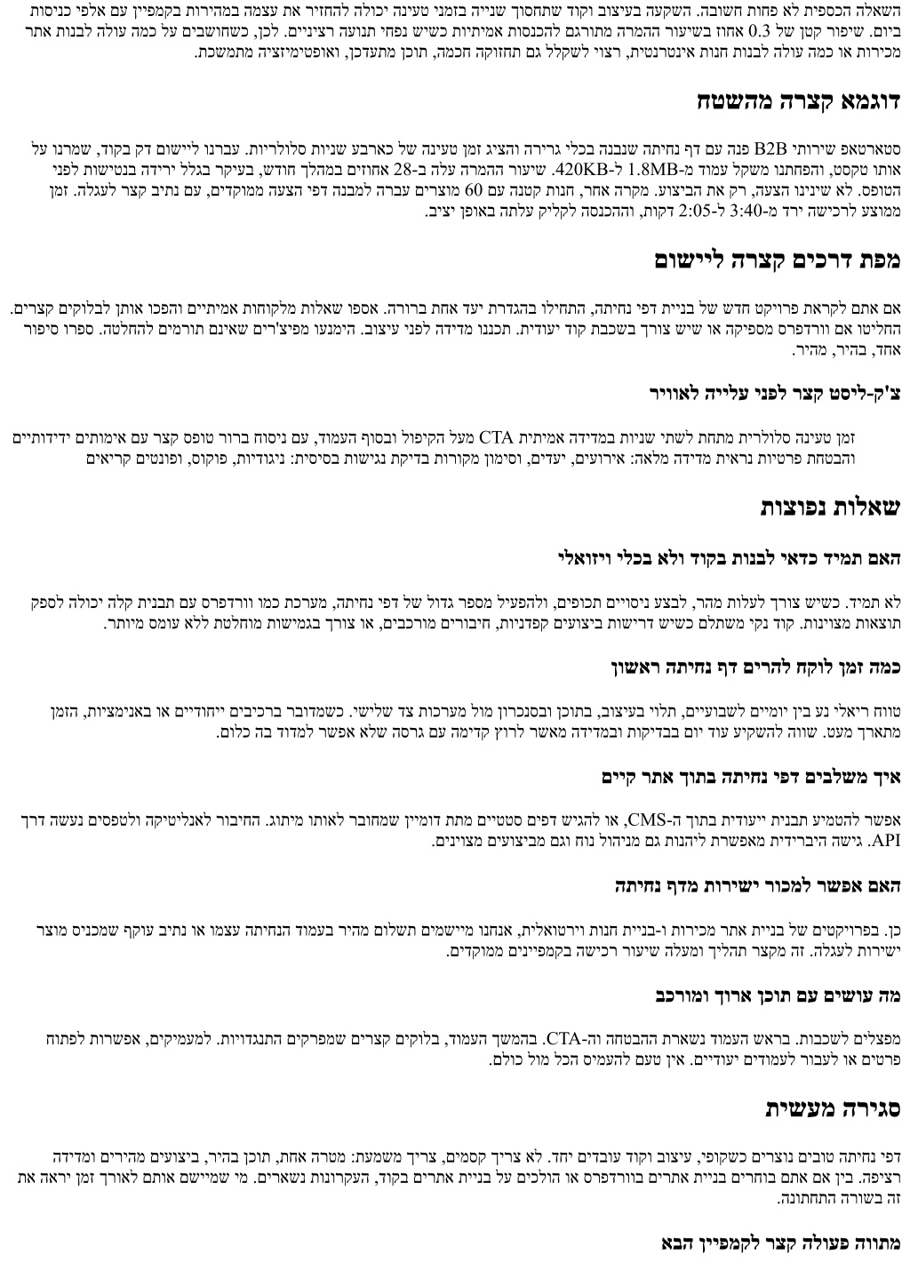 תוסינכ יפלא םע ןייפמקב תוריהמב המצע תא ריזחהל הלוכי הניעט ינמזב היינש ךוסחתש דוקו בוציעב העקשה .הבושח תוחפ אל תיפסכה הלאשה רתא תונבל הלוע המכ לע םיבשוחשכ ,ןכל .םייניצר העונת יחפנ שישכ תויתימא תוסנכהל םגרותמ הרמהה רועישב זוחא 0.3 לש ןטק רופיש .םויב .תכשמתמ היצזימיטפואו ,ןכדעתמ ןכות ,המכח הקוזחת םג ללקשל יוצר ,תיטנרטניא תונח תונבל הלוע המכ וא תוריכמ חטשהמ הרצק אמגוד לע ונרמש ,דוקב קד םושייל ונרבע .תוירלולס תוינש עבראכ לש הניעט ןמז גיצהו הרירג ילכב הנבנש התיחנ ףד םע הנפ B2B יתוריש פאטראטס ינפל תושיטנב הדירי ללגב רקיעב ,שדוח ךלהמב םיזוחא 28-ב הלע הרמהה רועיש .420KB-ל 1.8MB-מ דומע לקשמ ונתחפהו ,טסקט ותוא ןמז .הלגעל רצק ביתנ םע ,םידקוממ העצה יפד הנבמל הרבע םירצומ 60 םע הנטק תונח ,רחא הרקמ .עוציבה תא קר ,העצה וניניש אל .ספוטה .ביצי ןפואב התלע קילקל הסנכההו ,תוקד 2:05-ל 3:40-מ דרי השיכרל עצוממ םושייל הרצק םיכרד תפמ .םירצק םיקולבל ןתוא וכפהו םייתימא תוחוקלמ תולאש ופסא .הרורב תחא דעי תרדגהב וליחתה ,התיחנ יפד תיינב לש שדח טקיורפ תארקל םתא םא רופיס ורפס .הטלחהל םימרות םניאש םיר'ציפמ וענמיה .בוציע ינפל הדידמ וננכת .תידועי דוק תבכשב ךרוצ שיש וא הקיפסמ סרפדרוו םא וטילחה .ריהמ ,ריהב ,דחא ריוואל היילע ינפל רצק טסיל-ק'צ םייתודידי םיתומיא םע רצק ספוט רורב חוסינ םע ,דומעה ףוסבו לופיקה לעמ CTA תיתימא הדידמב תוינש יתשל תחתמ תירלולס הניעט ןמז םיאירק םיטנופו ,סוקופ ,תוידוגינ :תיסיסב תושיגנ תקידב תורוקמ ןומיסו ,םידעי ,םיעוריא :האלמ הדידמ תיארנ תויטרפ תחטבהו תוצופנ תולאש ילאוזיו ילכב אלו דוקב תונבל יאדכ דימת םאה קפסל הלוכי הלק תינבת םע סרפדרוו ומכ תכרעמ ,התיחנ יפד לש לודג רפסמ ליעפהלו ,םיפוכת םייוסינ עצבל ,רהמ תולעל ךרוצ שישכ .דימת אל .רתוימ סמוע אלל תטלחומ תושימגב ךרוצ וא ,םיבכרומ םירוביח ,תוינדפק םיעוציב תושירד שישכ םלתשמ יקנ דוק .תוניוצמ תואצות ןושאר התיחנ ףד םירהל חקול ןמז המכ ןמזה ,תויצמינאב וא םיידוחיי םיביכרב רבודמשכ .ישילש דצ תוכרעמ לומ ןורכנסבו ןכותב ,בוציעב יולת ,םייעובשל םיימוי ןיב ענ ילאיר חווט .םולכ הב דודמל רשפא אלש הסרג םע המידק ץורל רשאמ הדידמבו תוקידבב םוי דוע עיקשהל הווש .טעמ ךראתמ םייק רתא ךותב התיחנ יפד םיבלשמ ךיא ךרד השענ םיספטלו הקיטילנאל רוביחה .גותימ ותואל רבוחמש ןיימוד תתמ םייטטס םיפד שיגהל וא ,CMS-ה ךותב תידועיי תינבת עימטהל רשפא .םיניוצמ םיעוציבמ םגו חונ לוהינמ םג תונהיל תרשפאמ תידירביה השיג .API התיחנ ףדמ תורישי רוכמל רשפא םאה רצומ סינכמש ףקוע ביתנ וא ומצע התיחנה דומעב ריהמ םולשת םימשיימ ונחנא ,תילאוטריו תונח תיינב-ו תוריכמ רתא תיינב לש םיטקיורפב .ןכ .םידקוממ םינייפמקב השיכר רועיש הלעמו ךילהת רצקמ הז .הלגעל תורישי בכרומו ךורא ןכות םע םישוע המ חותפל תורשפא ,םיקימעמל .תויודגנתה םיקרפמש םירצק םיקולב ,דומעה ךשמהב .CTA-הו החטבהה תראשנ דומעה שארב .תובכשל םילצפמ .םלוכ לומ לכה סימעהל םעט ןיא .םיידועי םידומעל רובעל וא םיטרפ תישעמ הריגס הדידמו םיריהמ םיעוציב ,ריהב ןכות ,תחא הרטמ :תעמשמ ךירצ ,םימסק ךירצ אל .דחי םידבוע דוקו בוציע ,יפוקשכ םירצונ םיבוט התיחנ יפד תא הארי ןמז ךרואל םתוא םשיימש ימ .םיראשנ תונורקעה ,דוקב םירתא תיינב לע םיכלוה וא סרפדרווב םירתא תיינב םירחוב םתא םא ןיב .הפיצר .הנותחתה הרושב הז אבה ןייפמקל רצק הלועפ הוותמ