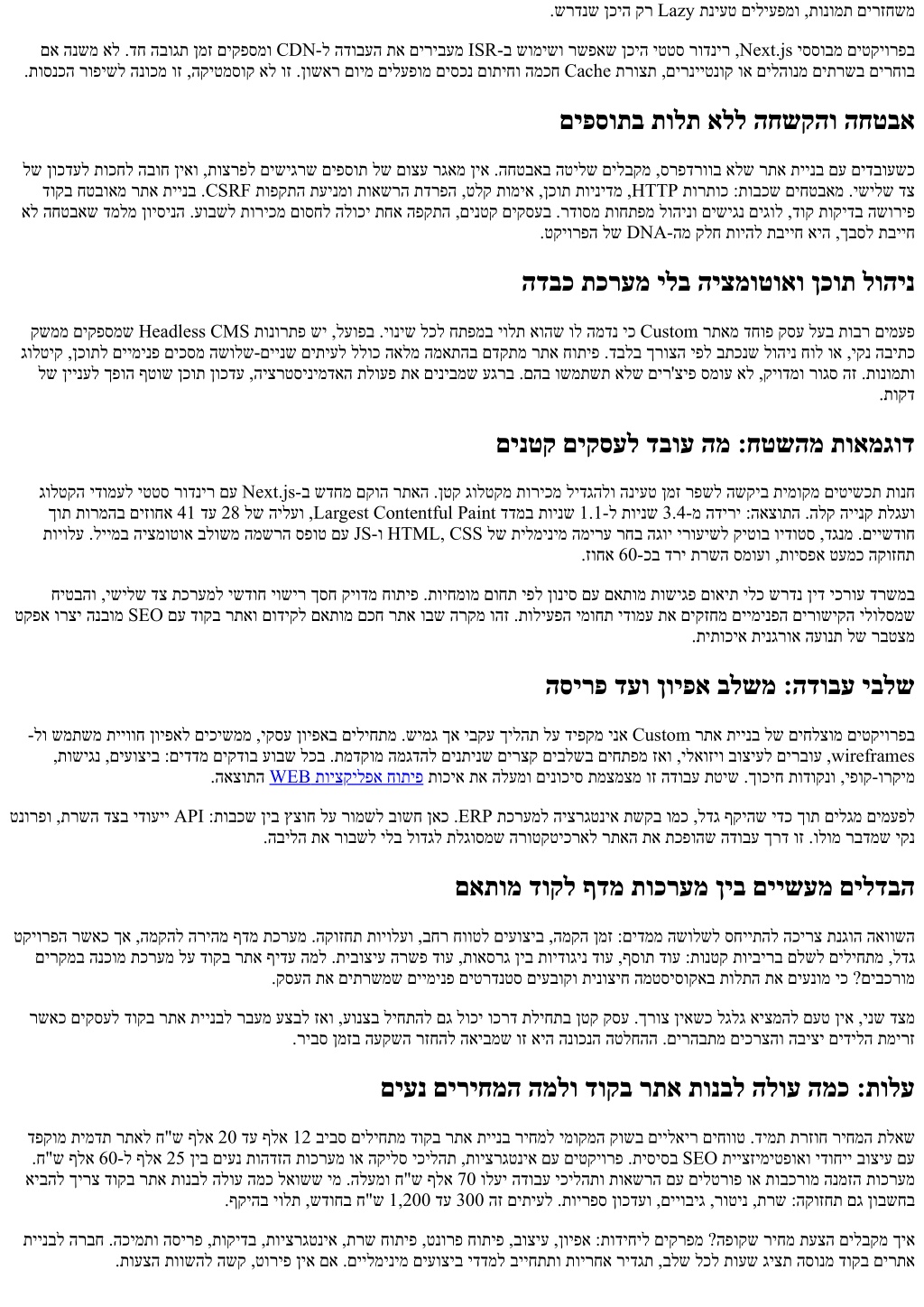 .שרדנש ןכיה קר Lazy תניעט םיליעפמו ,תונומת םירזחשמ םא הנשמ אל .דח הבוגת ןמז םיקפסמו CDN-ל הדובעה תא םיריבעמ ISR-ב שומישו רשפאש ןכיה יטטס רודניר ,Next.js יססובמ םיטקיורפב .תוסנכה רופישל הנוכמ וז ,הקיטמסוק אל וז .ןושאר םוימ םילעפומ םיסכנ םותיחו המכח Cache תרוצת ,םירנייטנוק וא םילהונמ םיתרשב םירחוב םיפסותב תולת אלל החשקהו החטבא לש ןוכדעל תוכחל הבוח ןיאו ,תוצרפל םישיגרש םיפסות לש םוצע רגאמ ןיא .החטבאב הטילש םילבקמ ,סרפדרווב אלש רתא תיינב םע םידבועשכ דוקב חטבואמ רתא תיינב .CSRF תופקתה תעינמו תואשרה תדרפה ,טלק תומיא ,ןכות תוינידמ ,HTTP תורתוכ :תובכש םיחטבאמ .ישילש דצ אל החטבאש דמלמ ןויסינה .עובשל תוריכמ םוסחל הלוכי תחא הפקתה ,םינטק םיקסעב .רדוסמ תוחתפמ לוהינו םישיגנ םיגול ,דוק תוקידב השוריפ .טקיורפה לש DNA-המ קלח תויהל תבייח איה ,ךבסל תבייח הדבכ תכרעמ ילב היצמוטואו ןכות לוהינ קשממ םיקפסמש Headless CMS תונורתפ שי ,לעופב .יוניש לכל חתפמב יולת אוהש ול המדנ יכ Custom רתאמ דחופ קסע לעב תובר םימעפ גולטיק ,ןכותל םיימינפ םיכסמ השולש-םיינש םיתיעל ללוכ האלמ המאתהב םדקתמ רתא חותיפ .דבלב ךרוצה יפל בתכנש לוהינ חול וא ,יקנ הביתכ לש ןיינעל ךפוה ףטוש ןכות ןוכדע ,היצרטסינימדאה תלועפ תא םיניבמש עגרב .םהב ושמתשת אלש םיר'ציפ סמוע אל ,קיודמו רוגס הז .תונומתו .תוקד םינטק םיקסעל דבוע המ :חטשהמ תואמגוד גולטקה ידומעל יטטס רודניר םע Next.js-ב שדחמ םקוה רתאה .ןטק גולטקמ תוריכמ לידגהלו הניעט ןמז רפשל השקיב תימוקמ םיטישכת תונח ךות תורמהב םיזוחא 41 דע 28 לש הילעו ,Largest Contentful Paint דדמב תוינש 1.1-ל תוינש 3.4-מ הדירי :האצותה .הלק היינק תלגעו תויולע .ליימב היצמוטוא בלושמ המשרה ספוט םע JS-ו HTML, CSS לש תילמינימ המירע רחב הגוי ירועישל קיטוב וידוטס ,דגנמ .םיישדוח .זוחא 60-כב דרי תרשה סמועו ,תויספא טעמכ הקוזחת חיטבהו ,ישילש דצ תכרעמל ישדוח יושיר ךסח קיודמ חותיפ .תויחמומ םוחת יפל ןוניס םע םאתומ תושיגפ םואית ילכ שרדנ ןיד יכרוע דרשמב טקפא ורצי הנבומ SEO םע דוקב רתאו םודיקל םאתומ םכח רתא ובש הרקמ והז .תוליעפה ימוחת ידומע תא םיקזחמ םיימינפה םירושיקה ילולסמש .תיתוכיא תינגרוא העונת לש רבטצמ הסירפ דעו ןויפא בלשמ :הדובע יבלש -לו שמתשמ תייווח ןויפאל םיכישממ ,יקסע ןויפאב םיליחתמ .שימג ךא יבקע ךילהת לע דיפקמ ינא Custom רתא תיינב לש םיחלצומ םיטקיורפב ,תושיגנ ,םיעוציב :םידדמ םיקדוב עובש לכב .תמדקומ המגדהל םינתינש םירצק םיבלשב םיחתפמ זאו ,ילאוזיו בוציעל םירבוע ,wireframes .האצותה WEB תויצקילפא חותיפ תוכיא תא הלעמו םינוכיס תמצמצמ וז הדובע תטיש .ךוכיח תודוקנו ,יפוק-ורקימ טנורפו ,תרשה דצב ידועיי API :תובכש ןיב ץצוח לע רומשל בושח ןאכ .ERP תכרעמל היצרגטניא תשקב ומכ ,לדג ףקיהש ידכ ךות םילגמ םימעפל .הבילה תא רובשל ילב לודגל תלגוסמש הרוטקטיכראל רתאה תא תכפוהש הדובע ךרד וז .ולומ רבדמש יקנ םאתומ דוקל ףדמ תוכרעמ ןיב םיישעמ םילדבה טקיורפה רשאכ ךא ,המקהל הריהמ ףדמ תכרעמ .הקוזחת תויולעו ,בחר חווטל םיעוציב ,המקה ןמז :םידממ השולשל סחייתהל הכירצ תנגוה האוושה םירקמב הנכומ תכרעמ לע דוקב רתא ףידע המל .תיבוציע הרשפ דוע ,תואסרג ןיב תוידוגינ דוע ,ףסות דוע :תונטק תויבירב םלשל םיליחתמ ,לדג .קסעה תא םיתרשמש םיימינפ םיטרדנטס םיעבוקו תינוציח המטסיסוקאב תולתה תא םיענומ יכ ?םיבכרומ רשאכ םיקסעל דוקב רתא תיינבל רבעמ עצבל זאו ,עונצב ליחתהל םג לוכי וכרד תליחתב ןטק קסע .ךרוצ ןיאשכ לגלג איצמהל םעט ןיא ,ינש דצמ .ריבס ןמזב העקשה רזחהל האיבמש וז איה הנוכנה הטלחהה .םירהבתמ םיכרצהו הביצי םידילה תמירז םיענ םיריחמה המלו דוקב רתא תונבל הלוע המכ :תולע דפקומ תימדת רתאל ח"ש ףלא 20 דע ףלא 12 ביבס םיליחתמ דוקב רתא תיינב ריחמל ימוקמה קושב םיילאיר םיחווט .דימת תרזוח ריחמה תלאש .ח"ש ףלא 60-ל ףלא 25 ןיב םיענ תוהדזה תוכרעמ וא הקילס יכילהת ,תויצרגטניא םע םיטקיורפ .תיסיסב SEO תייצזימיטפואו ידוחיי בוציע םע איבהל ךירצ דוקב רתא תונבל הלוע המכ לאושש ימ .ה