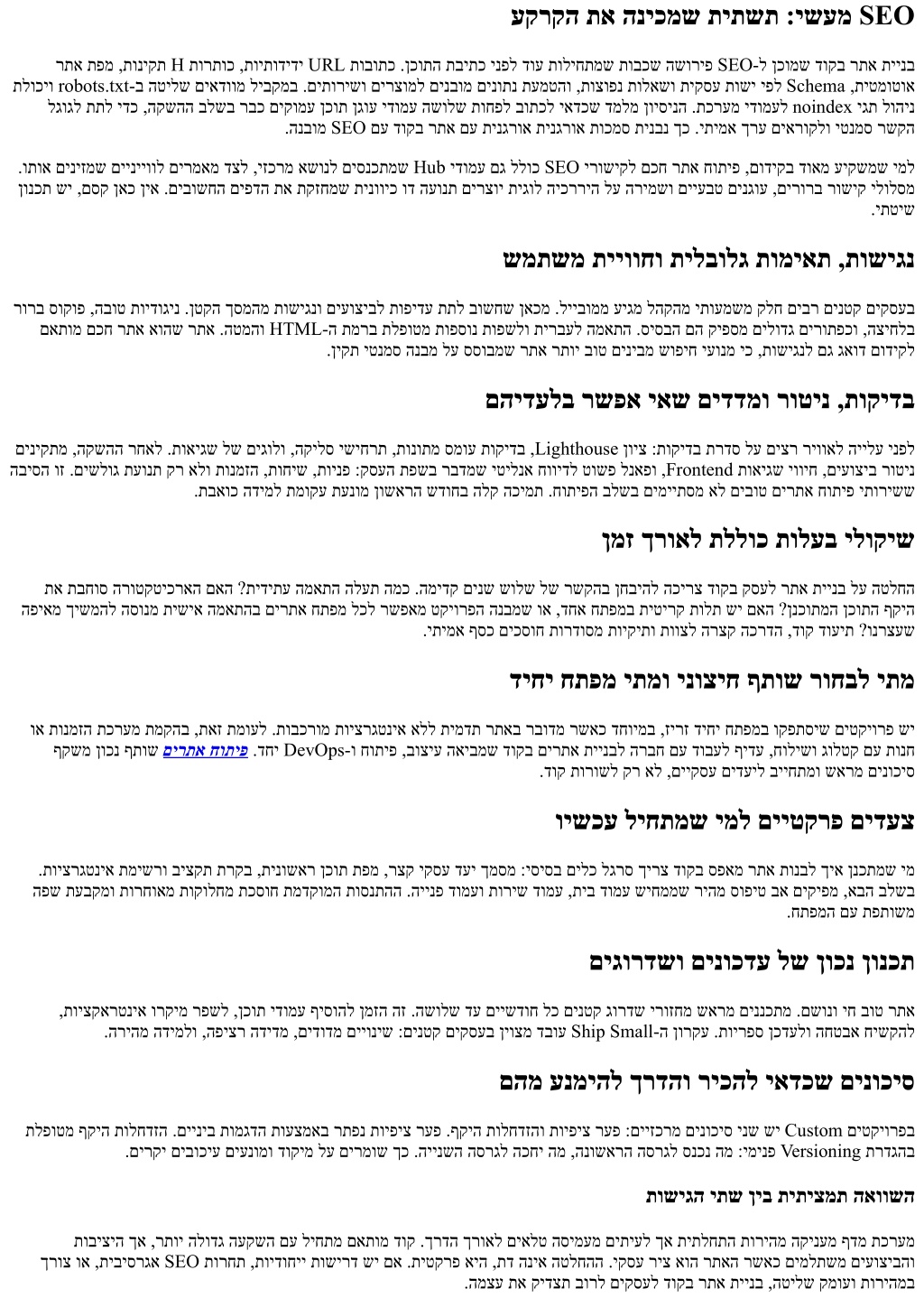 עקרקה תא הניכמש תיתשת :ישעמ SEO רתא תפמ ,תוניקת H תורתוכ ,תויתודידי URL תובותכ .ןכותה תביתכ ינפל דוע תוליחתמש תובכש השוריפ SEO-ל ןכומש דוקב רתא תיינב תלוכיו robots.txt-ב הטילש םיאדוומ ליבקמב .םיתורישו םירצומל םינבומ םינותנ תעמטהו ,תוצופנ תולאשו תיקסע תושי יפל Schema ,תיטמוטוא לגוגל תתל ידכ ,הקשהה בלשב רבכ םיקומע ןכות ןגוע ידומע השולש תוחפל בותכל יאדכש דמלמ ןויסינה .תכרעמ ידומעל noindex יגת לוהינ .הנבומ SEO םע דוקב רתא םע תינגרוא תינגרוא תוכמס תינבנ ךכ .יתימא ךרע םיארוקלו יטנמס רשקה .ותוא םיניזמש םיינייוול םירמאמ דצל ,יזכרמ אשונל םיסנכתמש Hub ידומע םג ללוכ SEO ירושיקל םכח רתא חותיפ ,םודיקב דואמ עיקשמש ימל ןונכת שי ,םסק ןאכ ןיא .םיבושחה םיפדה תא תקזחמש תינוויכ וד העונת םירצוי תיגול היכרריה לע הרימשו םייעבט םינגוע ,םירורב רושיק ילולסמ .יתטיש שמתשמ תייווחו תילבולג תומיאת ,תושיגנ רורב סוקופ ,הבוט תוידוגינ .ןטקה ךסמהמ תושיגנו םיעוציבל תופידע תתל בושחש ןאכמ .לייבוממ עיגמ להקהמ יתועמשמ קלח םיבר םינטק םיקסעב םאתומ םכח רתא אוהש רתא .הטמהו HTML-ה תמרב תלפוטמ תופסונ תופשלו תירבעל המאתה .סיסבה םה קיפסמ םילודג םירותפכו ,הציחלב .ןיקת יטנמס הנבמ לע ססובמש רתא רתוי בוט םיניבמ שופיח יעונמ יכ ,תושיגנל םג גאוד םודיקל םהידעלב רשפא יאש םידדמו רוטינ ,תוקידב םיניקתמ ,הקשהה רחאל .תואיגש לש םיגולו ,הקילס ישיחרת ,תונותמ סמוע תוקידב ,Lighthouse ןויצ :תוקידב תרדס לע םיצר ריוואל היילע ינפל הביסה וז .םישלוג תעונת קר אלו תונמזה ,תוחיש ,תוינפ :קסעה תפשב רבדמש יטילנא חווידל טושפ לנאפו ,Frontend תואיגש יוויח ,םיעוציב רוטינ .תבאוכ הדימל תמוקע תענומ ןושארה שדוחב הלק הכימת .חותיפה בלשב םימייתסמ אל םיבוט םירתא חותיפ יתורישש ןמז ךרואל תללוכ תולעב ילוקיש תא תבחוס הרוטקטיכראה םאה ?תידיתע המאתה הלעת המכ .המידק םינש שולש לש רשקהב ןחביהל הכירצ דוקב קסעל רתא תיינב לע הטלחה הפיאמ ךישמהל הסונמ תישיא המאתהב םירתא חתפמ לכל רשפאמ טקיורפה הנבמש וא ,דחא חתפמב תיטירק תולת שי םאה ?ןנכותמה ןכותה ףקיה .יתימא ףסכ םיכסוח תורדוסמ תויקיתו תווצל הרצק הכרדה ,דוק דועית ?ונרצעש דיחי חתפמ יתמו ינוציח ףתוש רוחבל יתמ וא תונמזה תכרעמ תמקהב ,תאז תמועל .תובכרומ תויצרגטניא אלל תימדת רתאב רבודמ רשאכ דחוימב ,זירז דיחי חתפמב וקפתסיש םיטקיורפ שי ףקשמ ןוכנ ףתוש םירתא חותיפ .דחי DevOps-ו חותיפ ,בוציע האיבמש דוקב םירתא תיינבל הרבח םע דובעל ףידע ,חולישו גולטק םע תונח .דוק תורושל קר אל ,םייקסע םידעיל בייחתמו שארמ םינוכיס וישכע ליחתמש ימל םייטקרפ םידעצ .תויצרגטניא תמישרו ביצקת תרקב ,תינושאר ןכות תפמ ,רצק יקסע דעי ךמסמ :יסיסב םילכ לגרס ךירצ דוקב ספאמ רתא תונבל ךיא ןנכתמש ימ הפש תעבקמו תורחואמ תוקולחמ תכסוח תמדקומה תוסנתהה .היינפ דומעו תוריש דומע ,תיב דומע שיחממש ריהמ סופיט בא םיקיפמ ,אבה בלשב .חתפמה םע תפתושמ םיגורדשו םינוכדע לש ןוכנ ןונכת ,תויצקארטניא ורקימ רפשל ,ןכות ידומע ףיסוהל ןמזה הז .השולש דע םיישדוח לכ םינטק גורדש ירוזחמ שארמ םיננכתמ .םשונו יח בוט רתא .הריהמ הדימלו ,הפיצר הדידמ ,םידודמ םייוניש :םינטק םיקסעב ןיוצמ דבוע Ship Small-ה ןורקע .תוירפס ןכדעלו החטבא חישקהל םהמ ענמיהל ךרדהו ריכהל יאדכש םינוכיס תלפוטמ ףקיה תולחדזה .םייניב תומגדה תועצמאב רתפנ תויפיצ רעפ .ףקיה תולחדזהו תויפיצ רעפ :םייזכרמ םינוכיס ינש שי Custom םיטקיורפב .םירקי םיבוכיע םיענומו דוקימ לע םירמוש ךכ .היינשה הסרגל הכחי המ ,הנושארה הסרגל סנכנ המ :ימינפ Versioning תרדגהב תושיגה יתש ןיב תיתיצמת האוושה תוביציה ךא ,רתוי הלודג העקשה םע ליחתמ םאתומ דוק .ךרדה ךרואל םיאלט הסימעמ םיתיעל ךא תיתלחתה תוריהמ הקינעמ ףדמ תכרעמ ךרוצ וא ,תיביסרגא SEO תורחת ,תוידוחיי תושירד שי םא .תיטקרפ איה ,תד הניא הטלחהה .יקסע ריצ אוה רתאה רשאכ םימלתשמ םיעוציבהו .המצע תא קידצת בורל םיקסעל דוקב רתא תיינב ,הטילש קמועו תוריהמב