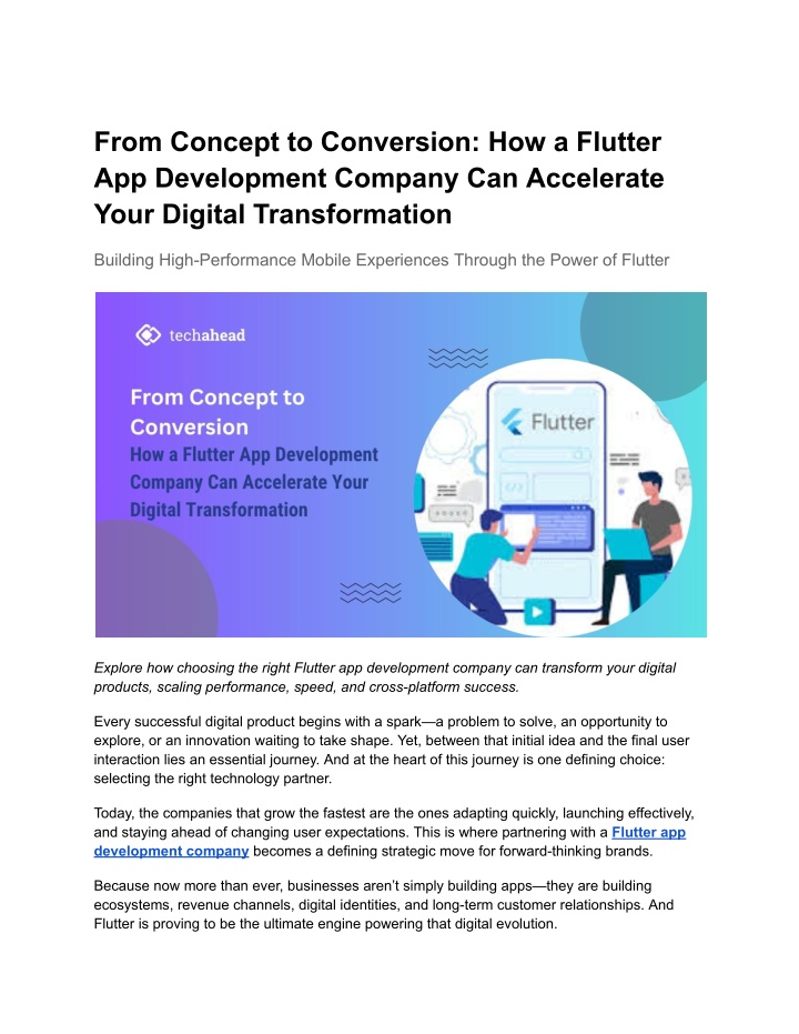 From Concept to Conversion: How a Flutter App Development Company Can Accelerate Your Digital Transformation Building High-Performance Mobile Experiences Through the Power of Flutter Explore how choosing the right Flutter app development company can transform your digital products, scaling performance, speed, and cross-platform success. Every successful digital product begins with a spark—a problem to solve, an opportunity to explore, or an innovation waiting to take shape. Yet, between that initial idea and the final user interaction lies an essential journey. And at the heart of this journey is one defining choice: selecting the right technology partner. Today, the companies that grow the fastest are the ones adapting quickly, launching effectively, and staying ahead of changing user expectations. This is where partnering with a Flutter app development company becomes a defining strategic move for forward-thinking brands. Because now more than ever, businesses aren’t simply building apps—they are building ecosystems, revenue channels, digital identities, and long-term customer relationships. And Flutter is proving to be the ultimate engine powering that digital evolution.