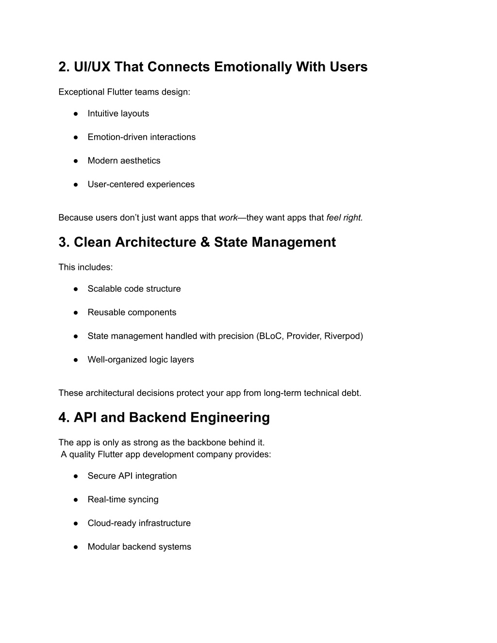 2. UI/UX That Connects Emotionally With Users Exceptional Flutter teams design: ● Intuitive layouts ● Emotion-driven interactions ● Modern aesthetics ● User-centered experiences Because users don’t just want apps that work—they want apps that feel right. 3. Clean Architecture & State Management This includes: ● Scalable code structure ● Reusable components ● State management handled with precision (BLoC, Provider, Riverpod) ● Well-organized logic layers These architectural decisions protect your app from long-term technical debt. 4. API and Backend Engineering The app is only as strong as the backbone behind it. A quality Flutter app development company provides: ● Secure API integration ● Real-time syncing ● Cloud-ready infrastructure ● Modular backend systems
