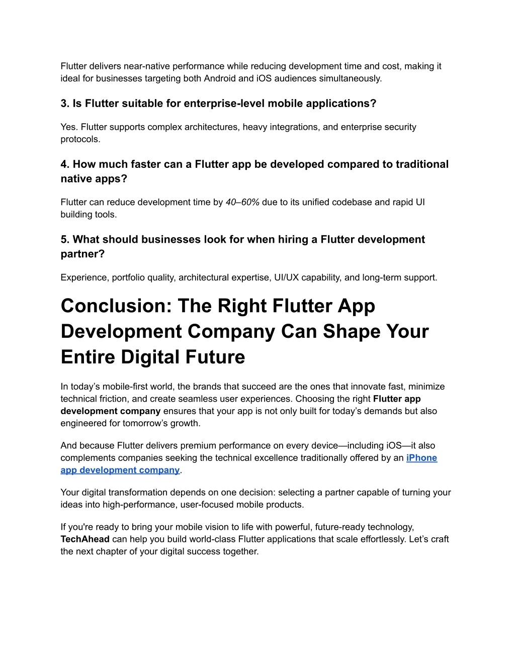Flutter delivers near-native performance while reducing development time and cost, making it ideal for businesses targeting both Android and iOS audiences simultaneously. 3. Is Flutter suitable for enterprise-level mobile applications? Yes. Flutter supports complex architectures, heavy integrations, and enterprise security protocols. 4. How much faster can a Flutter app be developed compared to traditional native apps? Flutter can reduce development time by 40–60% due to its unified codebase and rapid UI building tools. 5. What should businesses look for when hiring a Flutter development partner? Experience, portfolio quality, architectural expertise, UI/UX capability, and long-term support. Conclusion: The Right Flutter App Development Company Can Shape Your Entire Digital Future In today’s mobile-first world, the brands that succeed are the ones that innovate fast, minimize technical friction, and create seamless user experiences. Choosing the right Flutter app development company ensures that your app is not only built for today’s demands but also engineered for tomorrow’s growth. And because Flutter delivers premium performance on every device—including iOS—it also complements companies seeking the technical excellence traditionally offered by an iPhone app development company. Your digital transformation depends on one decision: selecting a partner capable of turning your ideas into high-performance, user-focused mobile products. If you're ready to bring your mobile vision to life with powerful, future-ready technology, TechAhead can help you build world-class Flutter applications that scale effortlessly. Let’s craft the next chapter of your digital success together.