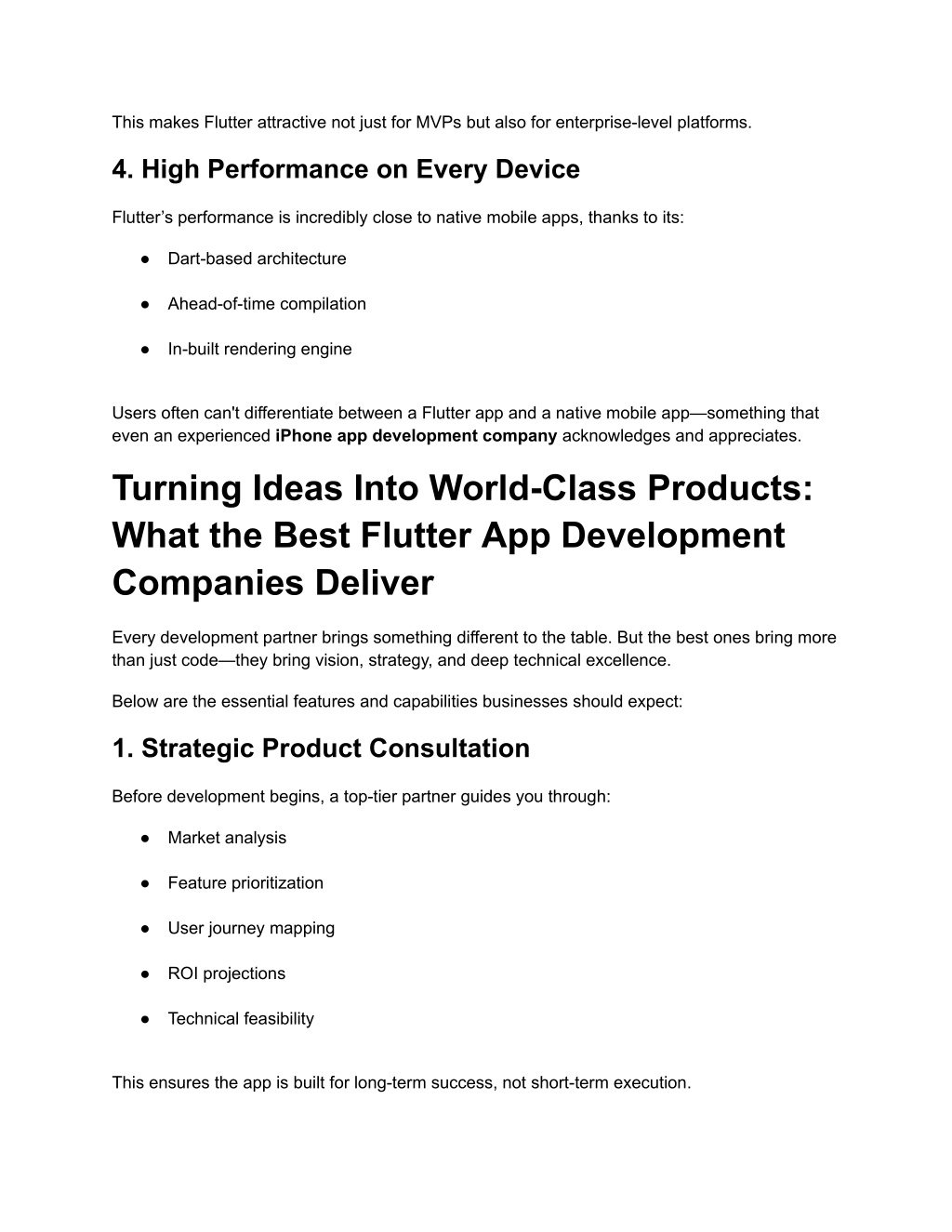 This makes Flutter attractive not just for MVPs but also for enterprise-level platforms. 4. High Performance on Every Device Flutter’s performance is incredibly close to native mobile apps, thanks to its: ● Dart-based architecture ● Ahead-of-time compilation ● In-built rendering engine Users often can't differentiate between a Flutter app and a native mobile app—something that even an experienced iPhone app development company acknowledges and appreciates. Turning Ideas Into World-Class Products: What the Best Flutter App Development Companies Deliver Every development partner brings something different to the table. But the best ones bring more than just code—they bring vision, strategy, and deep technical excellence. Below are the essential features and capabilities businesses should expect: 1. Strategic Product Consultation Before development begins, a top-tier partner guides you through: ● Market analysis ● Feature prioritization ● User journey mapping ● ROI projections ● Technical feasibility This ensures the app is built for long-term success, not short-term execution.