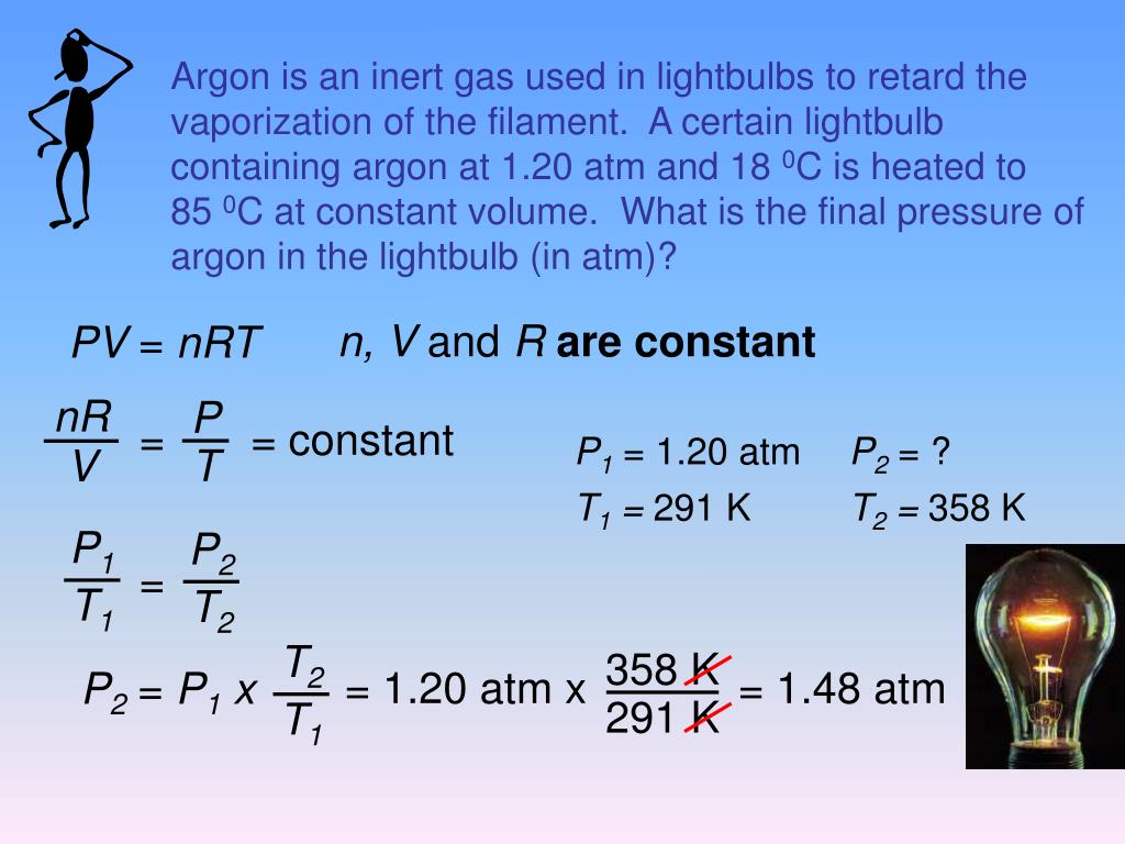P1 = 1.20 atm P2 = ? T1 = 291 K T2 = 358 K nR P = = T V P1 P2 T2 358 K T1 T1 T2 291 K = 1.20 atm x P2 = P1 x Argon is an inert gas used in lightbulbs to retard the vaporization of the filament. A certain lightbulb containing argon at 1.20 atm and 18 0C is heated to 85 0C at constant volume. What is the final pressure of argon in the lightbulb (in atm)? n, V and Rare constant PV = nRT = constant = 1.48 atm