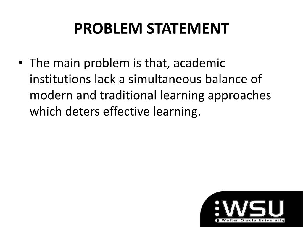 PROBLEM STATEMENT • The main problem is that, academic institutions lack a simultaneous balance of modern and traditional learning approaches which deters effective learning.