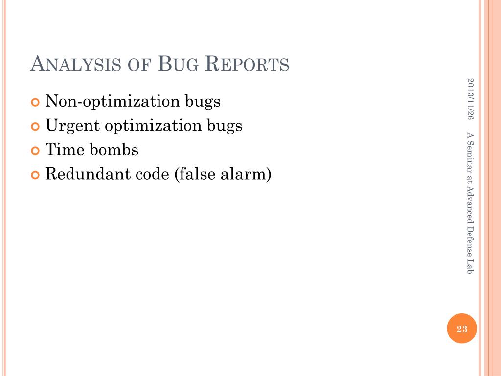 Analysis of Bug Reports • Non-optimization bugs • Urgent optimization bugs • Time bombs • Redundant code (false alarm) A Seminar at Advanced Defense Lab