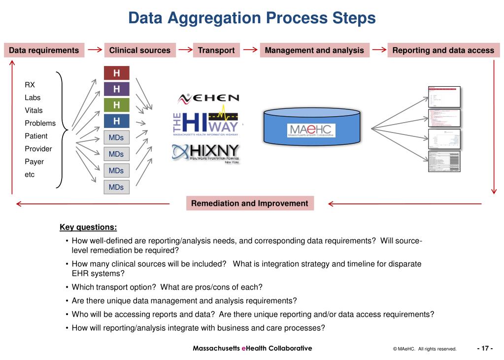 Data Aggregation Process Steps Data requirements Clinical sources Transport Management and analysis Reporting and data access H RX Labs Vitals Problems Patient Provider Payer etc H H H MDs MDs MDs MDs Remediation and Improvement • Key questions: • How well-defined are reporting/analysis needs, and corresponding data requirements? Will source-level remediation be required? • How many clinical sources will be included? What is integration strategy and timeline for disparate EHR systems? • Which transport option? What are pros/cons of each? • Are there unique data management and analysis requirements? • Who will be accessing reports and data? Are there unique reporting and/or data access requirements? • How will reporting/analysis integrate with business and care processes?