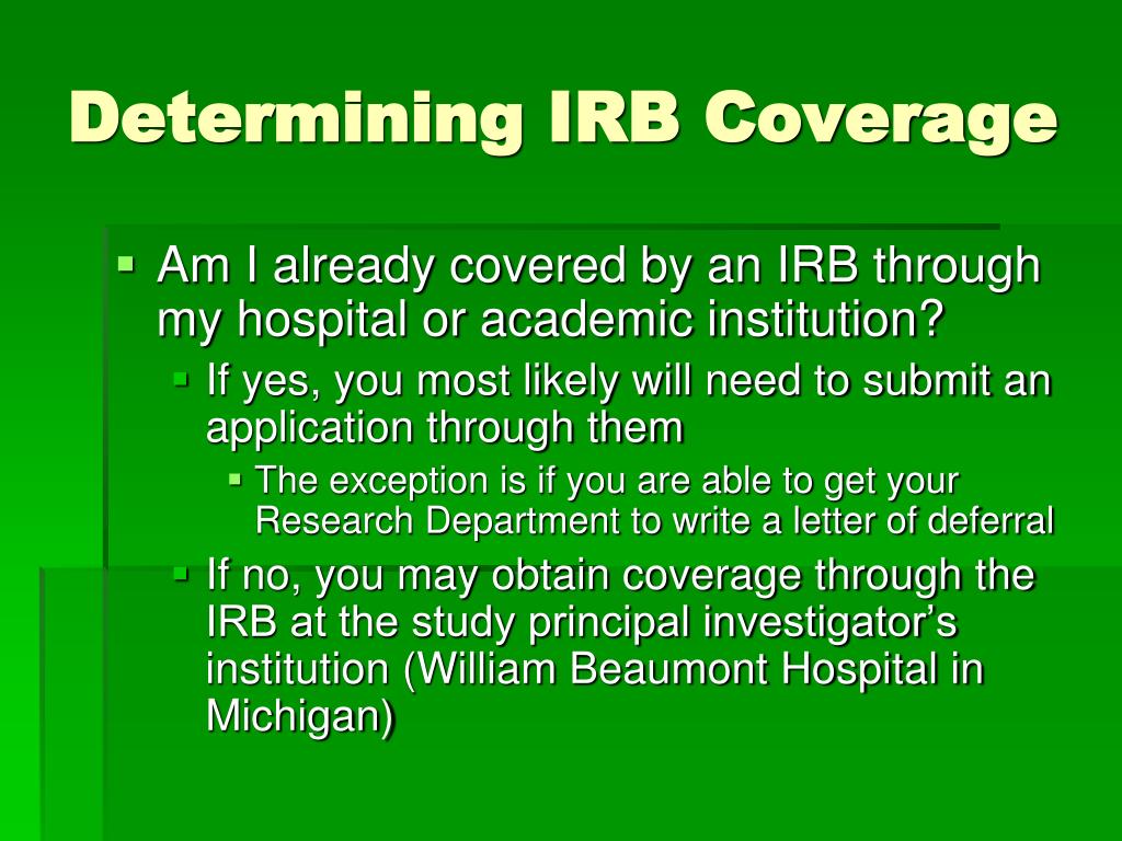 Determining IRB Coverage • Am I already covered by an IRB through my hospital or academic institution? • If yes, you most likely will need to submit an application through them • The exception is if you are able to get your Research Department to write a letter of deferral • If no, you may obtain coverage through the IRB at the study principal investigator’s institution (William Beaumont Hospital in Michigan)