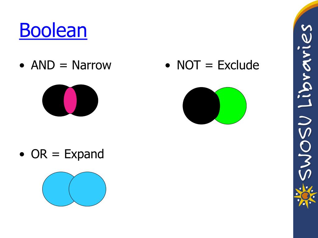 AND = Narrow OR = Expand Boolean • NOT = Exclude