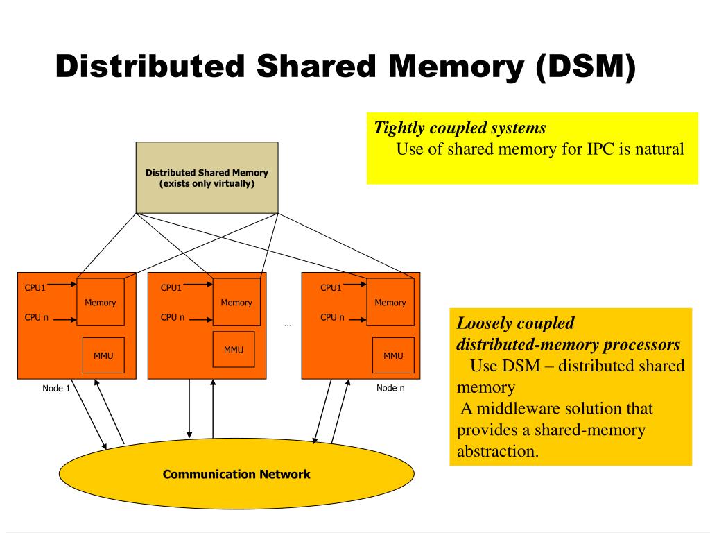 Distributed Shared Memory (DSM) Tightly coupled systems Use of shared memory for IPC is natural Distributed Shared Memory (exists only virtually) CPU1 Memory CPU1 Memory CPU1 Memory Memory CPU n CPU n CPU n Loosely coupled distributed-memory processors Use DSM – distributed shared memory A middleware solution that provides a shared-memory abstraction. … MMU MMU MMU Node n Node 1 Communication Network