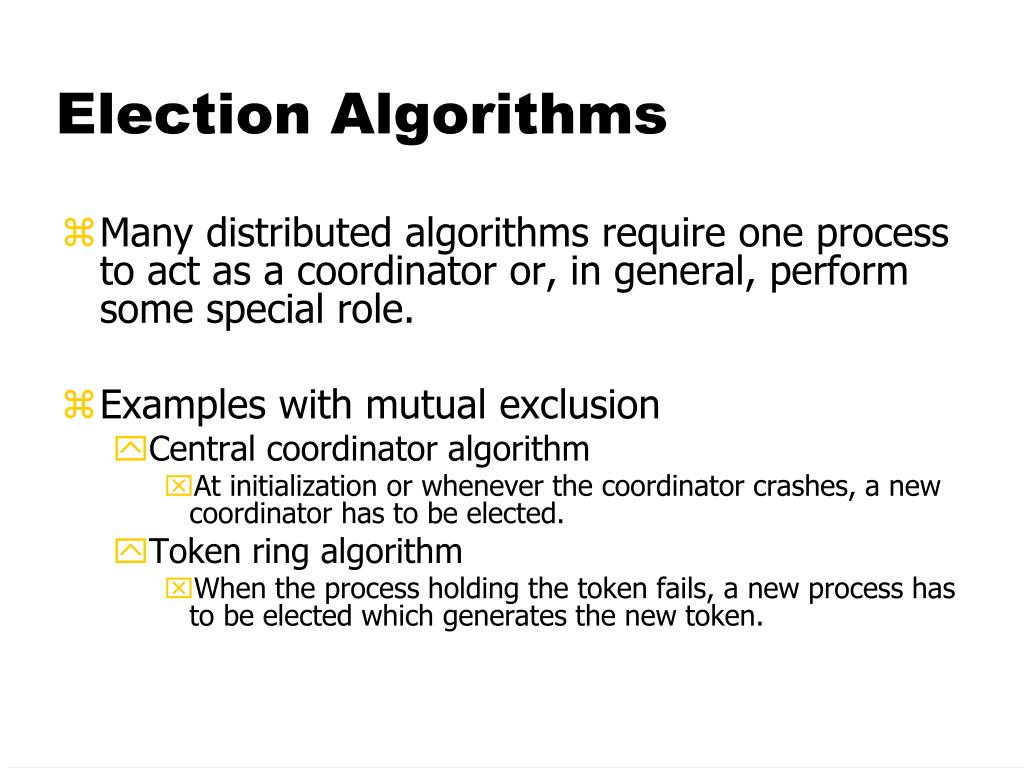Election Algorithms • Many distributed algorithms require one process to act as a coordinator or, in general, perform some special role. • Examples with mutual exclusion • Central coordinator algorithm • At initialization or whenever the coordinator crashes, a new coordinator has to be elected. • Token ring algorithm • When the process holding the token fails, a new process has to be elected which generates the new token.