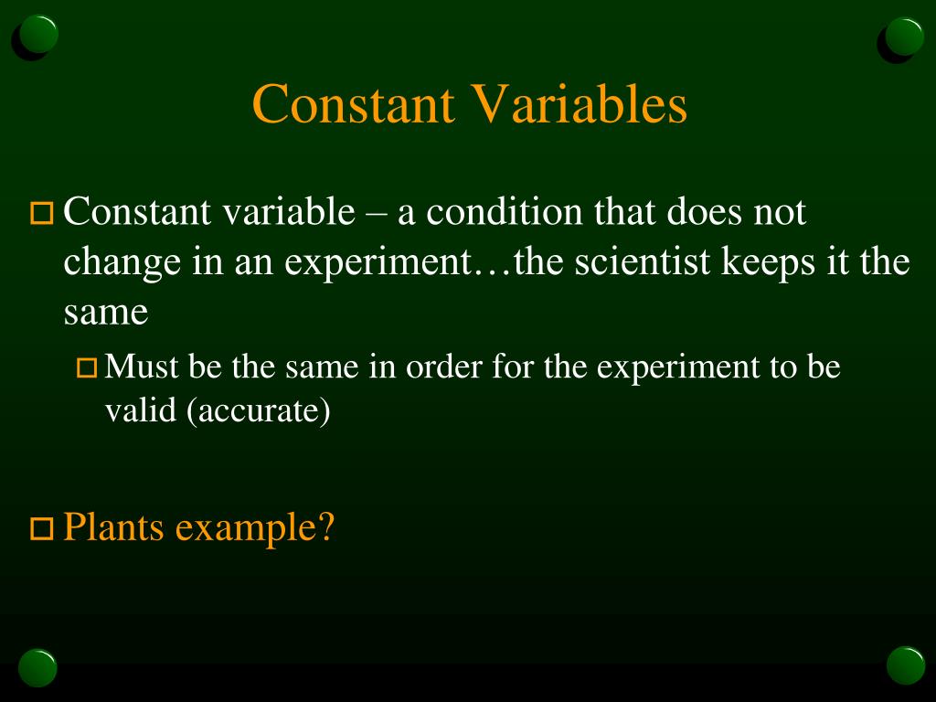 Constant Variables • Constant variable – a condition that does not change in an experiment…the scientist keeps it the same • Must be the same in order for the experiment to be valid (accurate) • Plants example?