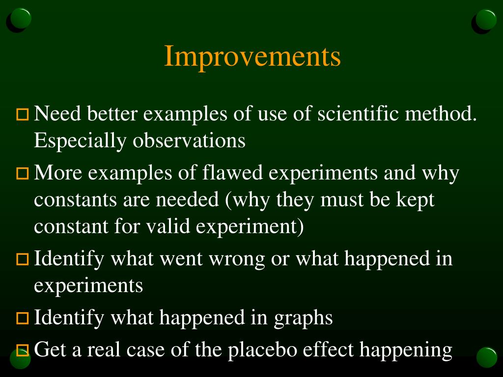 Improvements • Need better examples of use of scientific method. Especially observations • More examples of flawed experiments and why constants are needed (why they must be kept constant for valid experiment) • Identify what went wrong or what happened in experiments • Identify what happened in graphs • Get a real case of the placebo effect happening