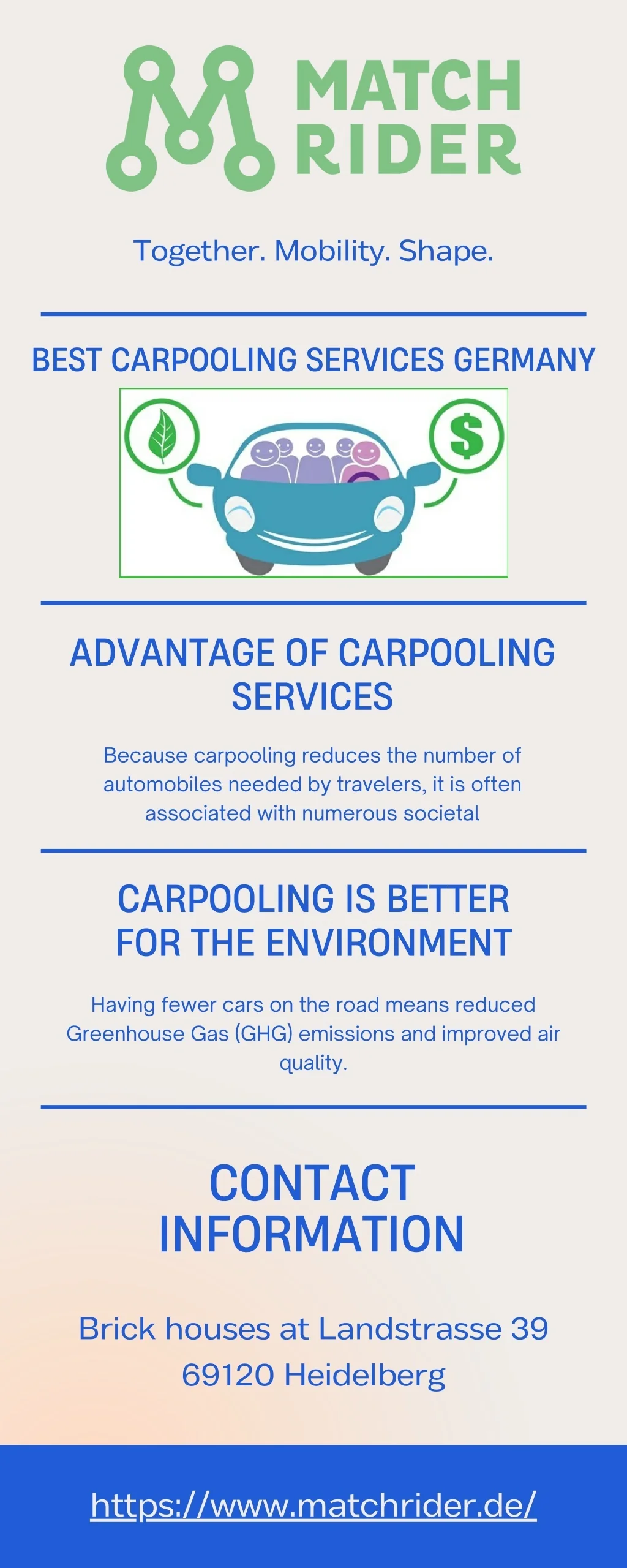 Together. Mobility. Shape. BEST CARPOOLING SERVICES GERMANY ADVANTAGE OF CARPOOLING SERVICES Because carpooling reduces the number of automobiles needed by travelers, it is often associated with numerous societal CARPOOLING IS BETTER FOR THE ENVIRONMENT Having fewer cars on the road means reduced Greenhouse Gas (GHG) emissions and improved air quality. CONTACT INFORMATION Brick houses at Landstrasse 39 69120 Heidelberg https://www.matchrider.de/