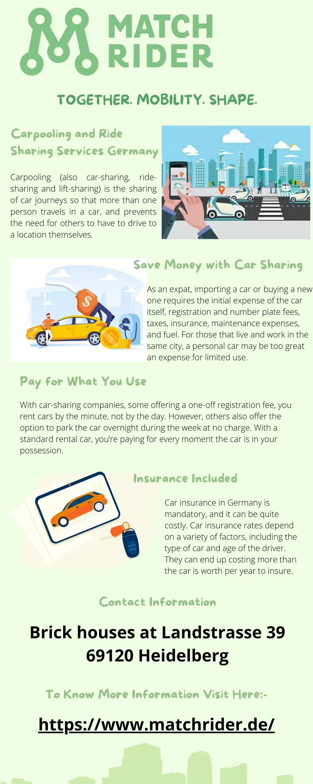 TOGETHER. MOBILITY. SHAPE. Carpooling and Ride Sharing Services Germany Carpooling (also car-sharing, ride- sharing and lift-sharing) is the sharing of car journeys so that more than one person travels in a car, and prevents the need for others to have to drive to a location themselves. Save Money with Car Sharing As an expat, importing a car or buying a new one requires the initial expense of the car itself, registration and number plate fees, taxes, insurance, maintenance expenses, and fuel. For those that live and work in the same city, a personal car may be too great an expense for limited use. Pay for What You Use With car-sharing companies, some offering a one-off registration fee, you rent cars by the minute, not by the day. However, others also offer the option to park the car overnight during the week at no charge. With a standard rental car, you’re paying for every moment the car is in your possession. Insurance Included Car insurance in Germany is mandatory, and it can be quite costly. Car insurance rates depend on a variety of factors, including the type of car and age of the driver. They can end up costing more than the car is worth per year to insure. Contact Information Brick houses at Landstrasse 39 69120 Heidelberg To Know More Information Visit Here:- https://www.matchrider.de/