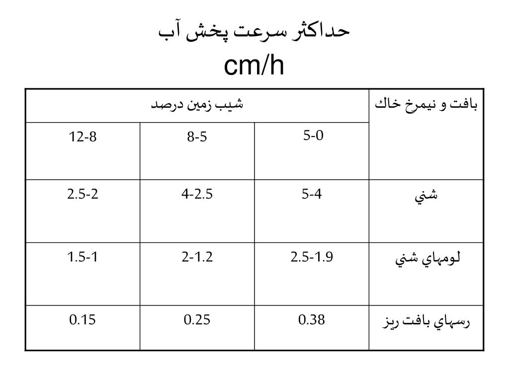 میزان پخش آب dg=(q/(Sl.Sm))*3600 dg : شدت پخش ناخالص (میلیمتر در ساعت) q : دبی (لیتر در ثانیه) Sl : فاصله آبپاشها (متر) Sm : فاصله لاترالها (متر) da=dg(1-Ls) Da : شدت پخش خالص (میلیمتر در ساعت) Ls : تلفات تبخیر و باد (اعشار)