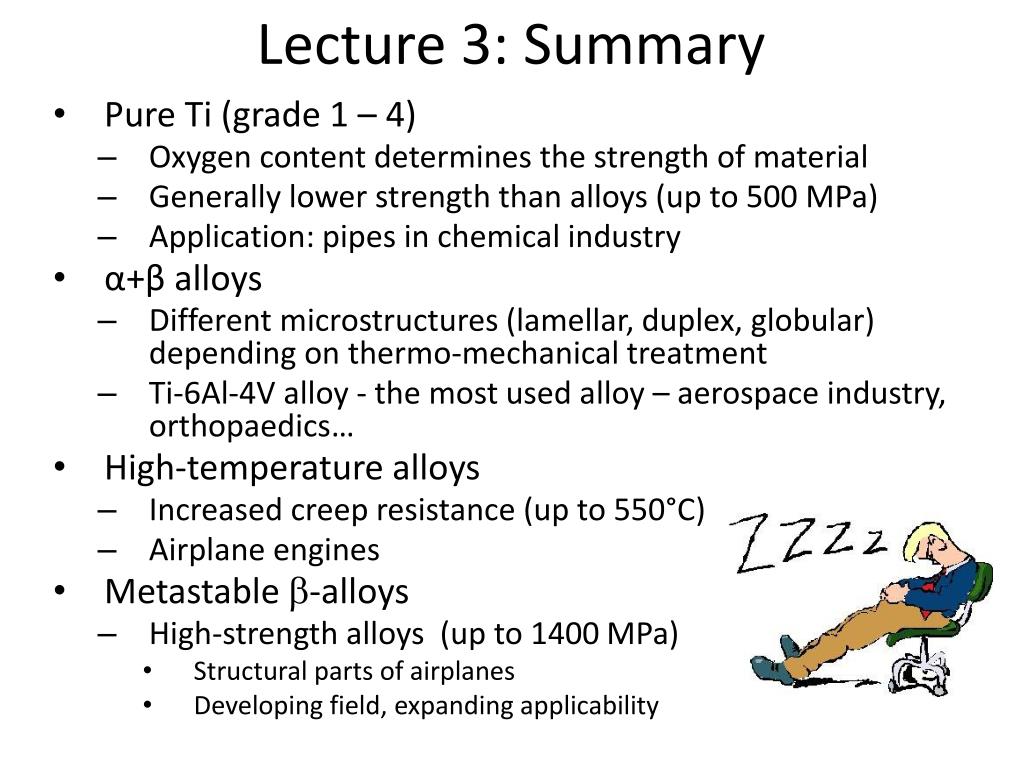 Lecture 3: Summary • Pure Ti (grade 1 – 4) • Oxygen content determines the strength of material • Generally lower strength than alloys (up to 500 MPa) • Application: pipes in chemical industry • α+β alloys • Different microstructures (lamellar, duplex, globular) depending on thermo-mechanical treatment • Ti-6Al-4V alloy - the most used alloy – aerospace industry, orthopaedics… • High-temperature alloys • Increased creep resistance (up to 550°C) • Airplane engines • Metastable b-alloys • High-strength alloys (up to 1400 MPa) • Structural parts of airplanes • Developing field, expanding applicability