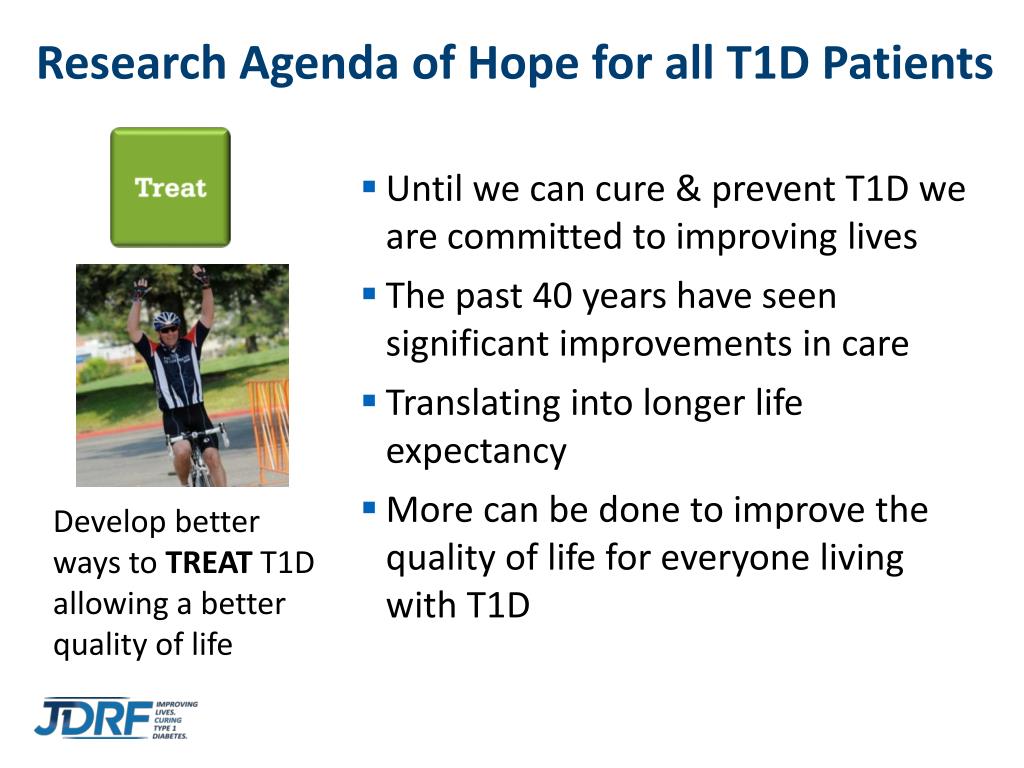 Research Agenda of Hope for all T1D Patients • Until we can cure & prevent T1D we are committed to improving lives • The past 40 years have seen significant improvements in care • Translating into longer life expectancy • More can be done to improve the quality of life for everyone living with T1D Aaron – Why Treat? Develop better ways to TREAT T1D allowing a better quality of life