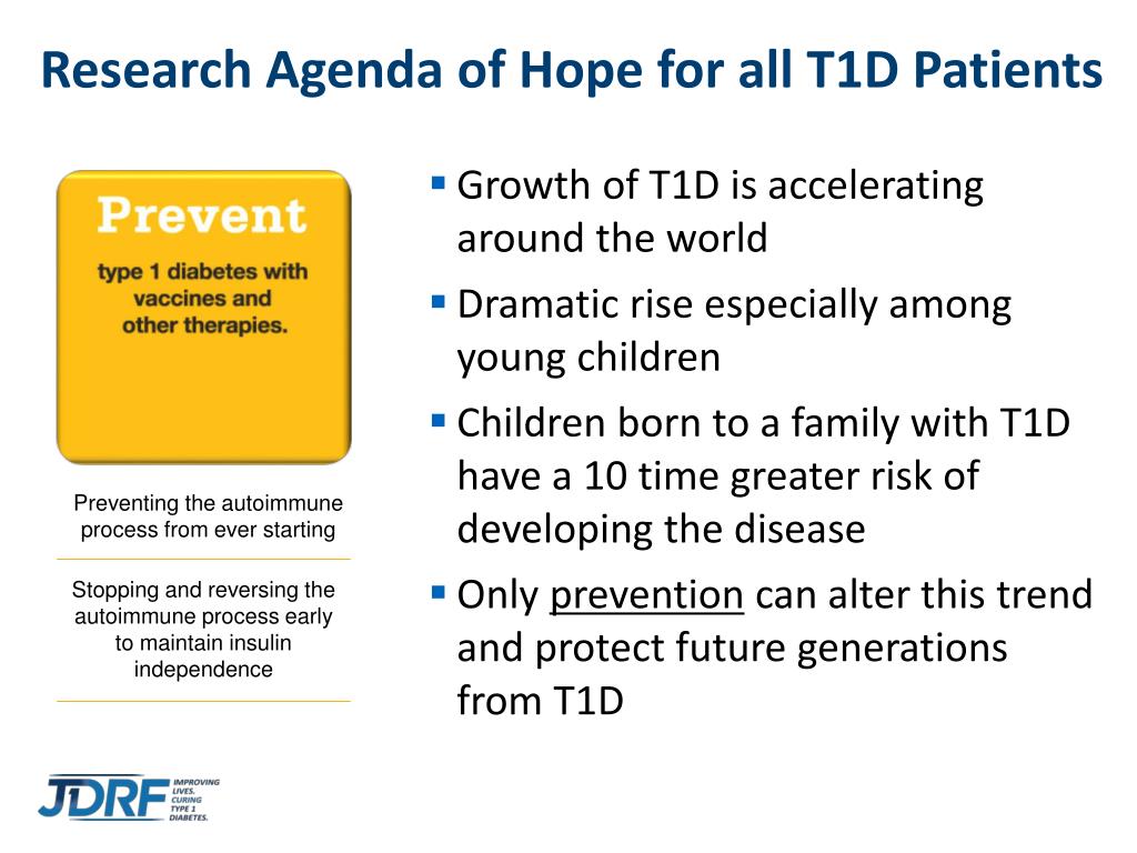 Research Agenda of Hope for all T1D Patients • Growth of T1D is accelerating around the world • Dramatic rise especially among young children • Children born to a family with T1D have a 10 time greater risk of developing the disease • Only prevention can alter this trend and protect future generations from T1D Preventing the autoimmune process from ever starting Stopping and reversing the autoimmune process early to maintain insulin independence