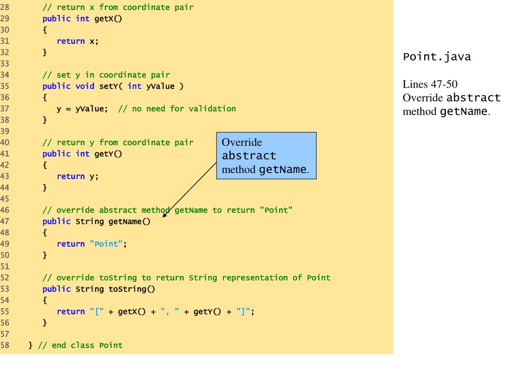 Override abstract method getName. 28 // return x from coordinate pair 29 publicint getX() 30 { 31 return x; 32 } 33 34 // set y in coordinate pair 35 publicvoid setY( int yValue ) 36 { 37 y = yValue; // no need for validation 38 } 39 40 // return y from coordinate pair 41 publicint getY() 42 { 43 return y; 44 } 45 46 // override abstract method getName to return "Point" 47 public String getName() 48 { 49 return"Point"; 50 } 51 52 // override toString to return String representation of Point 53 public String toString() 54 { 55 return"[" + getX() + ", " + getY() + "]"; 56 } 57 58 } // end class Point Point.javaLines 47-50Override abstract method getName.