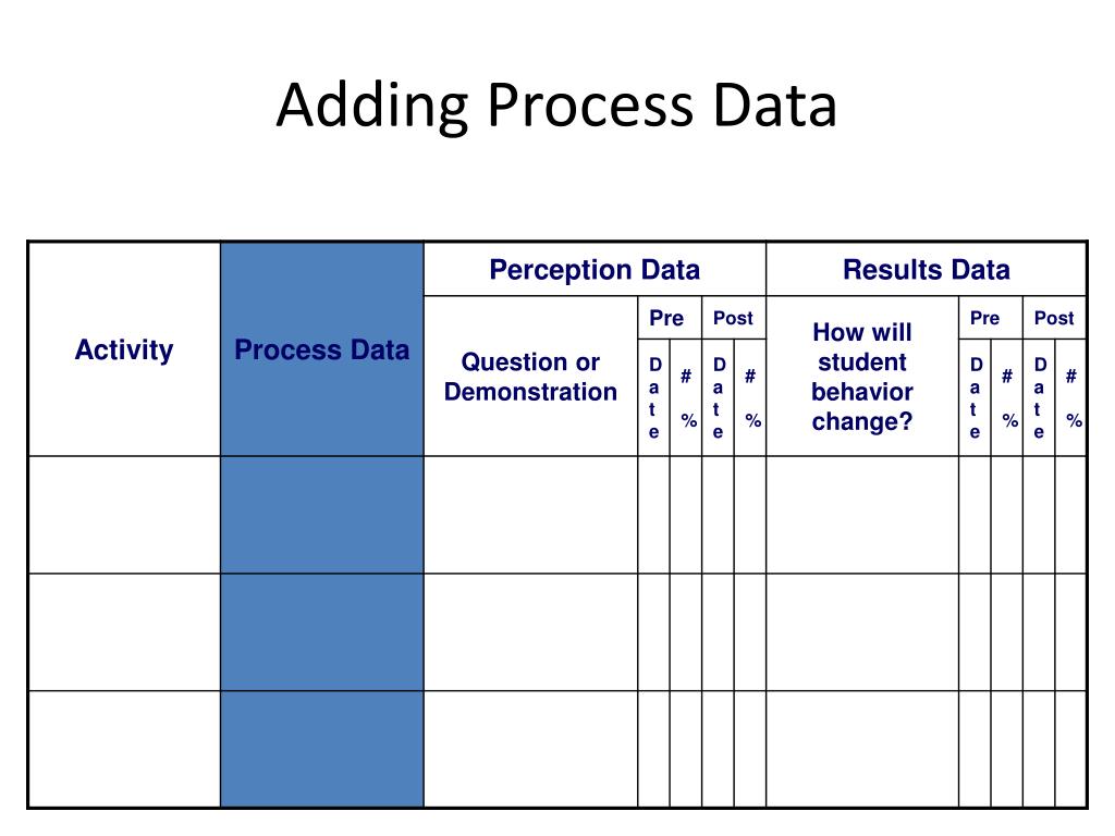 Perception Data • “What others think, know or demonstrate” data. • Metacognitive Awareness • Measures competency achieved, knowledge gained or attitudes beliefs of students • Pre-post • Competency achievement • Surveys • Evaluations • Measures what students are perceived to have gained in knowledge